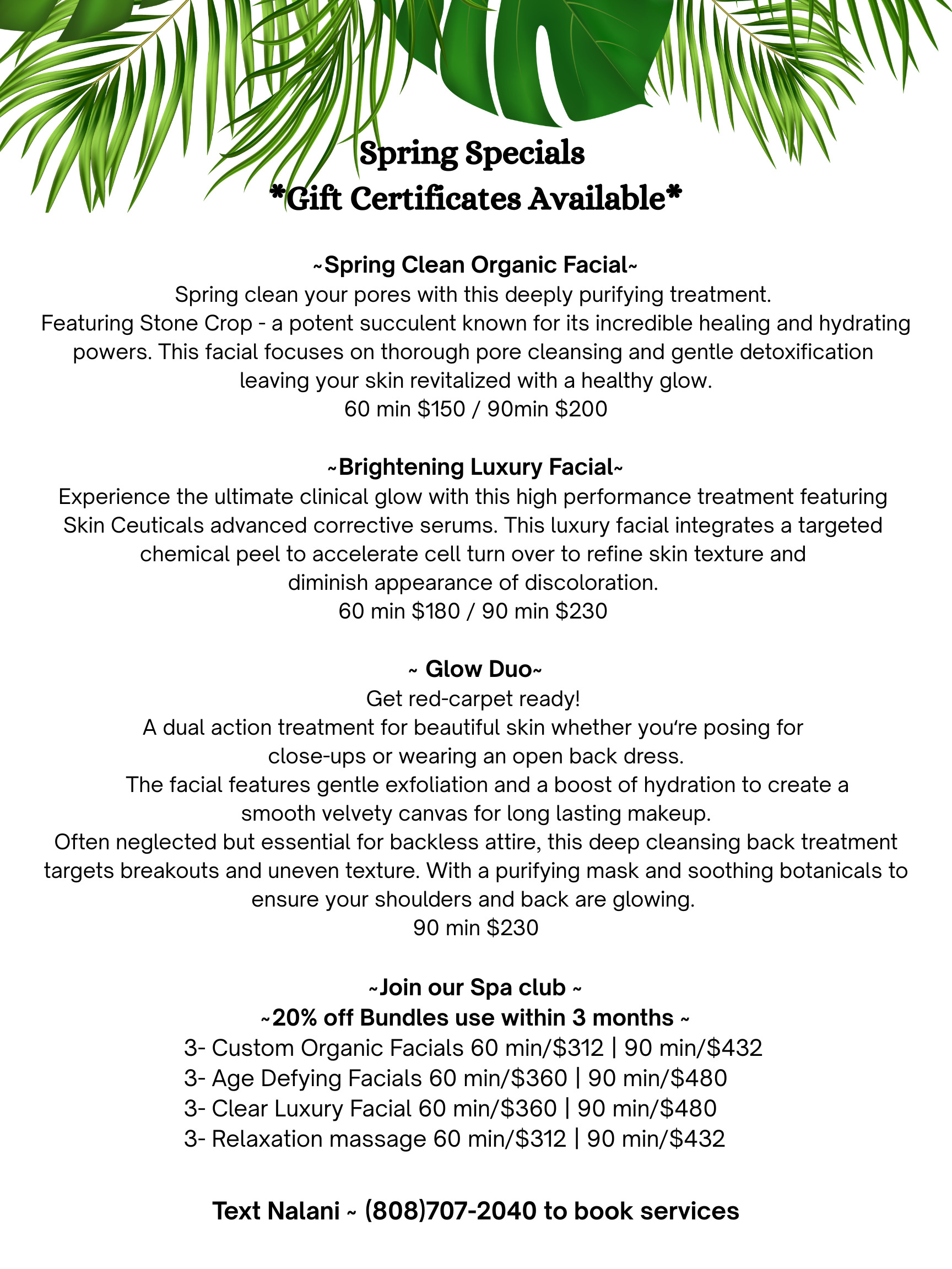 Indulge yourself or surprise a loved one with a soothing massage, revitalizing facial, or both! These specials make the perfect gift for everyone on your list. Gift certificates available and can be mailed to you or pick up at our upcountry location.
