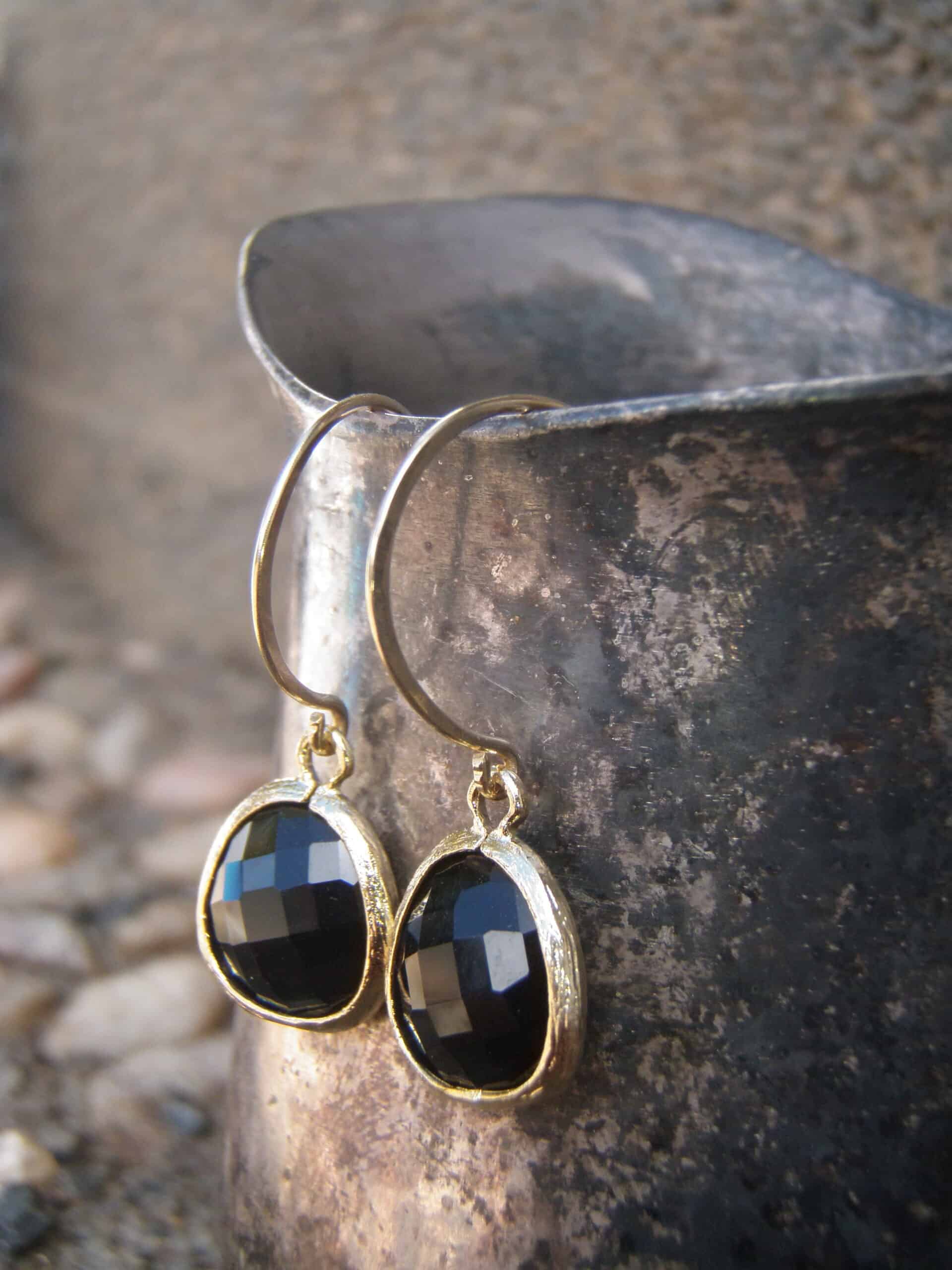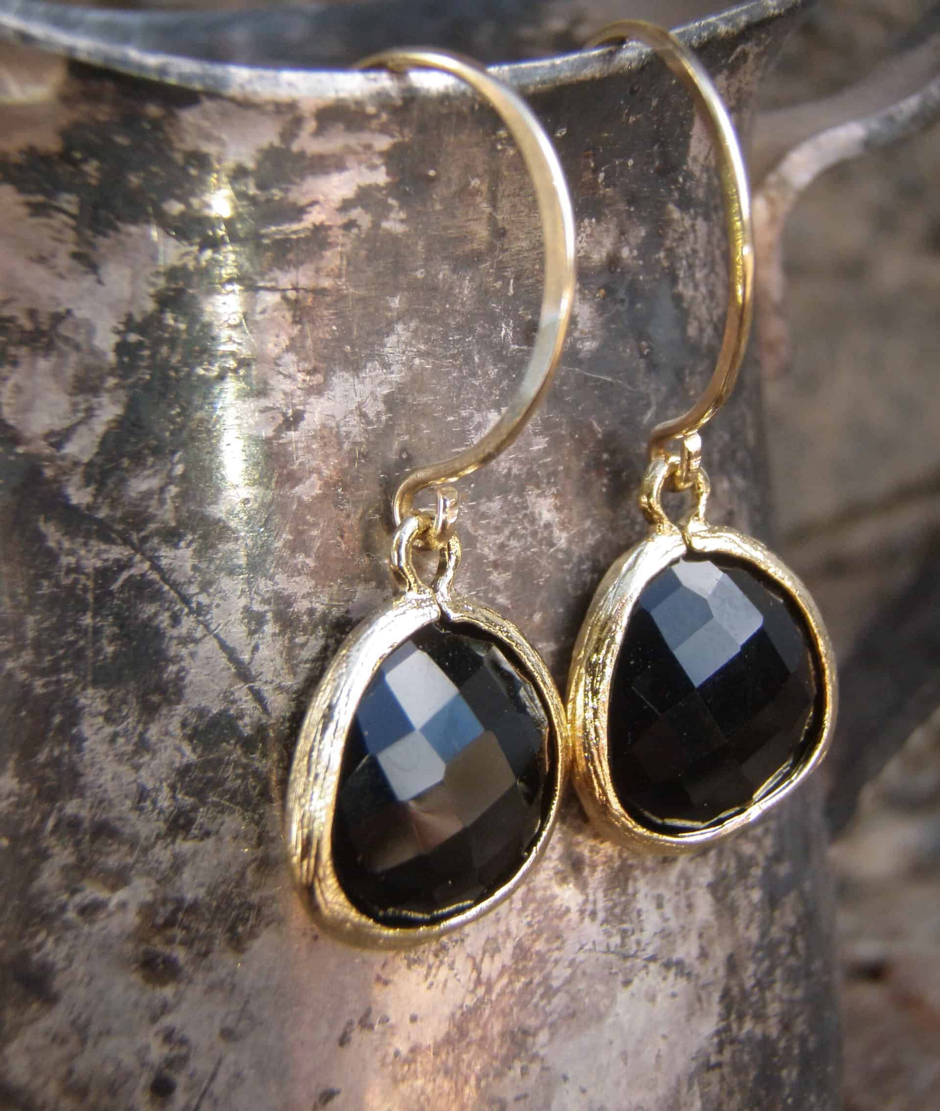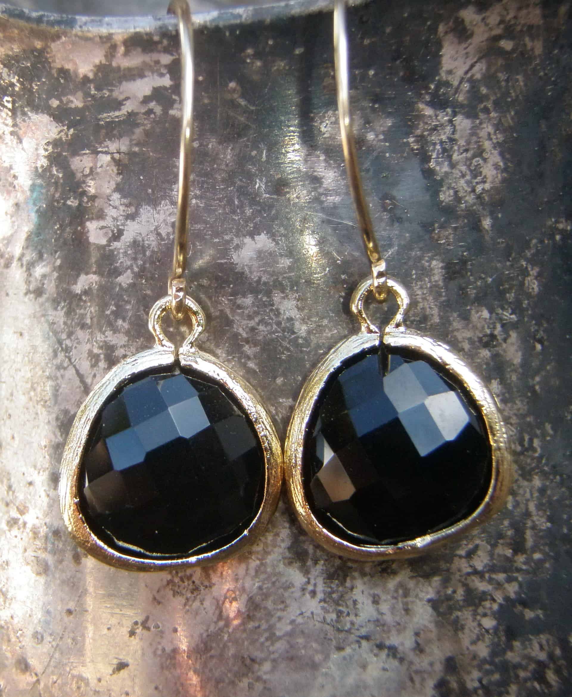 Faceted black glass drops dangle down from hand made 14k gold filled ear wires.