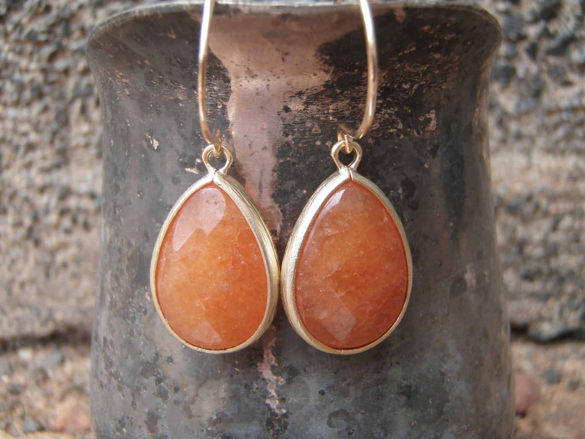 Faceted glass pendant in a beautiful carnelian stone color dangles down from hand made 14k gold filled ear wires.