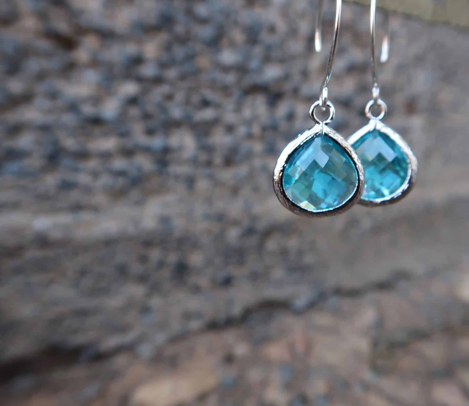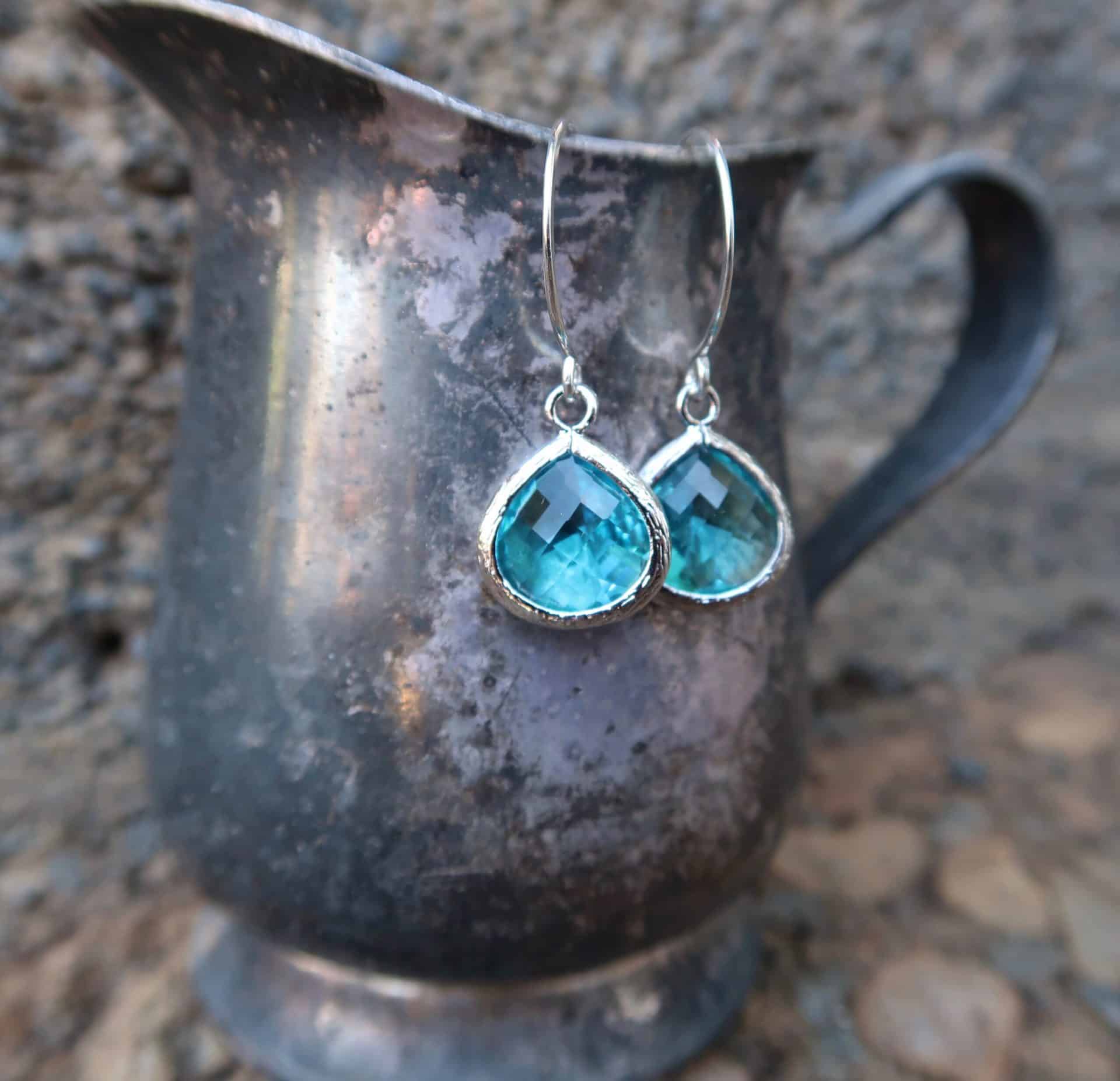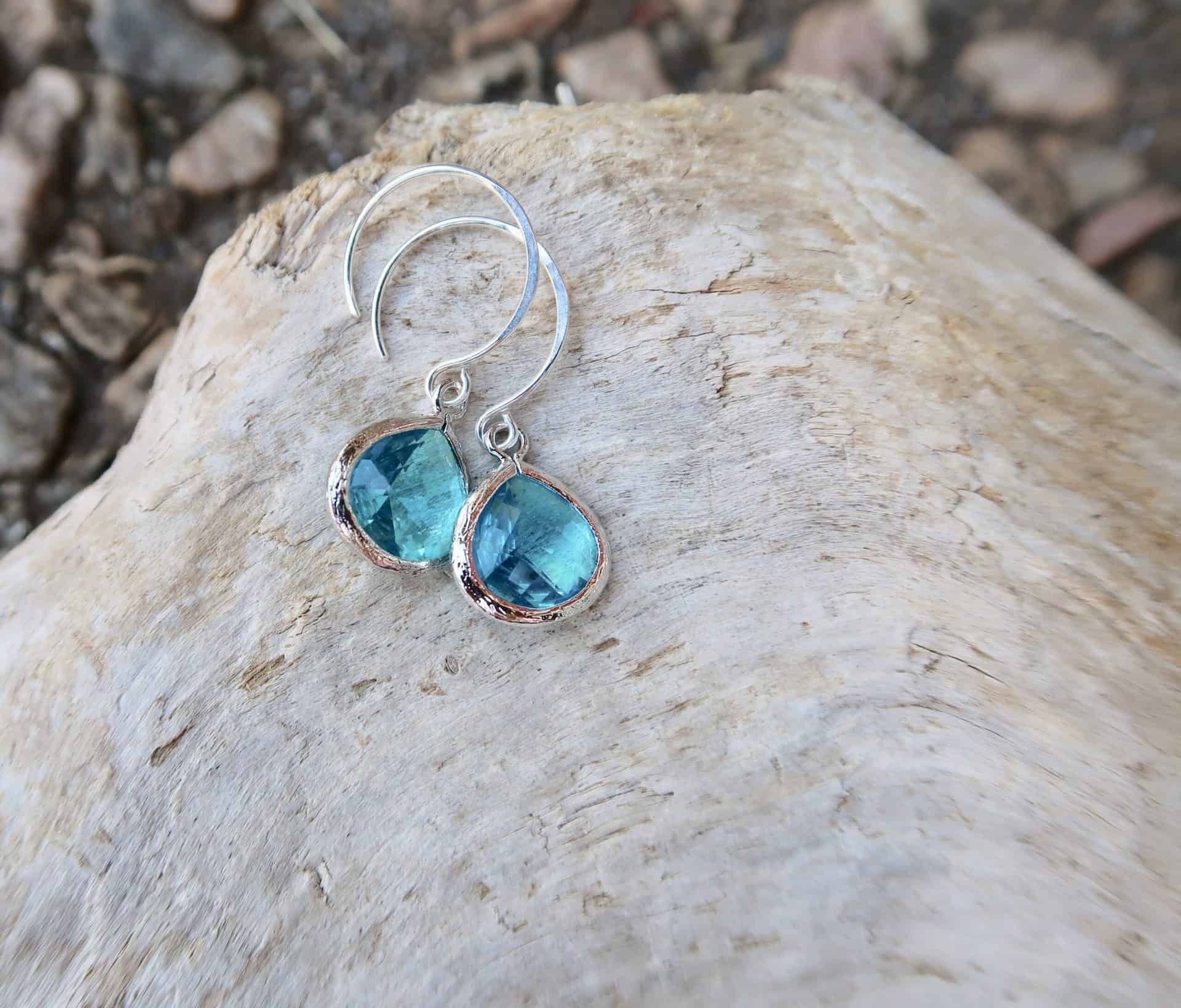 Faceted sapphire glass pendants hang down on hand made sterling silver ear wires. They measure 11/4 inches long.