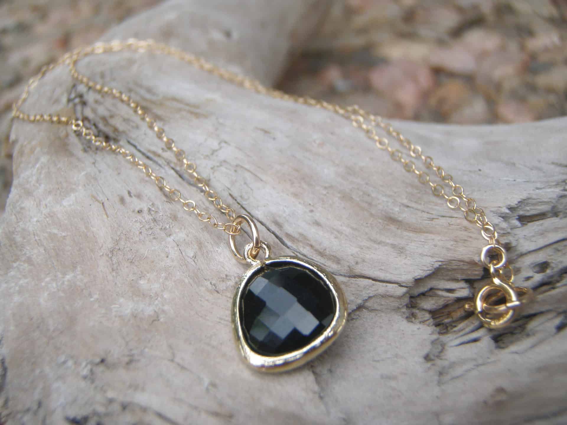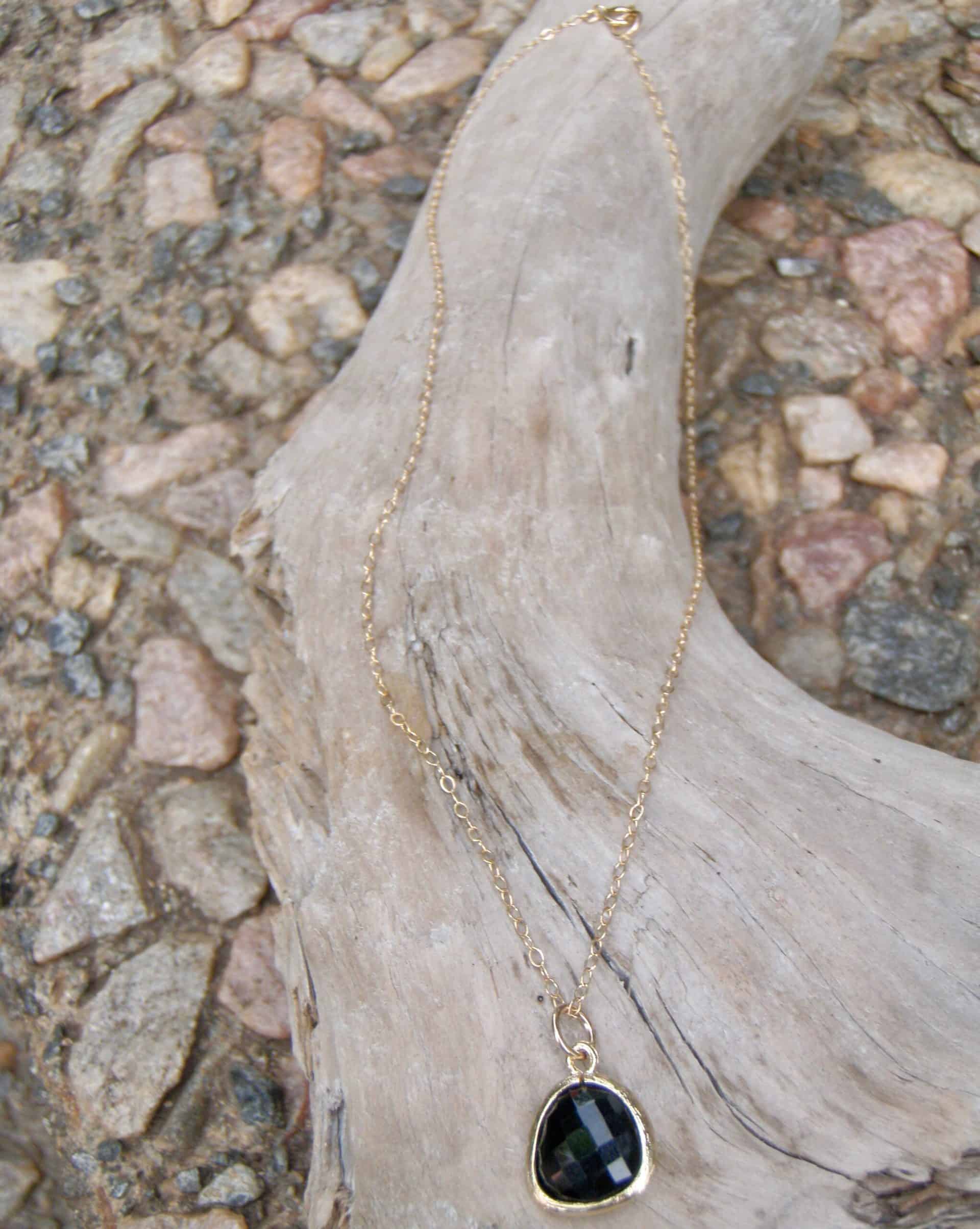 Faceted black glass drops set in gold plated bezel on a 16 inch 14k gold filled necklace.