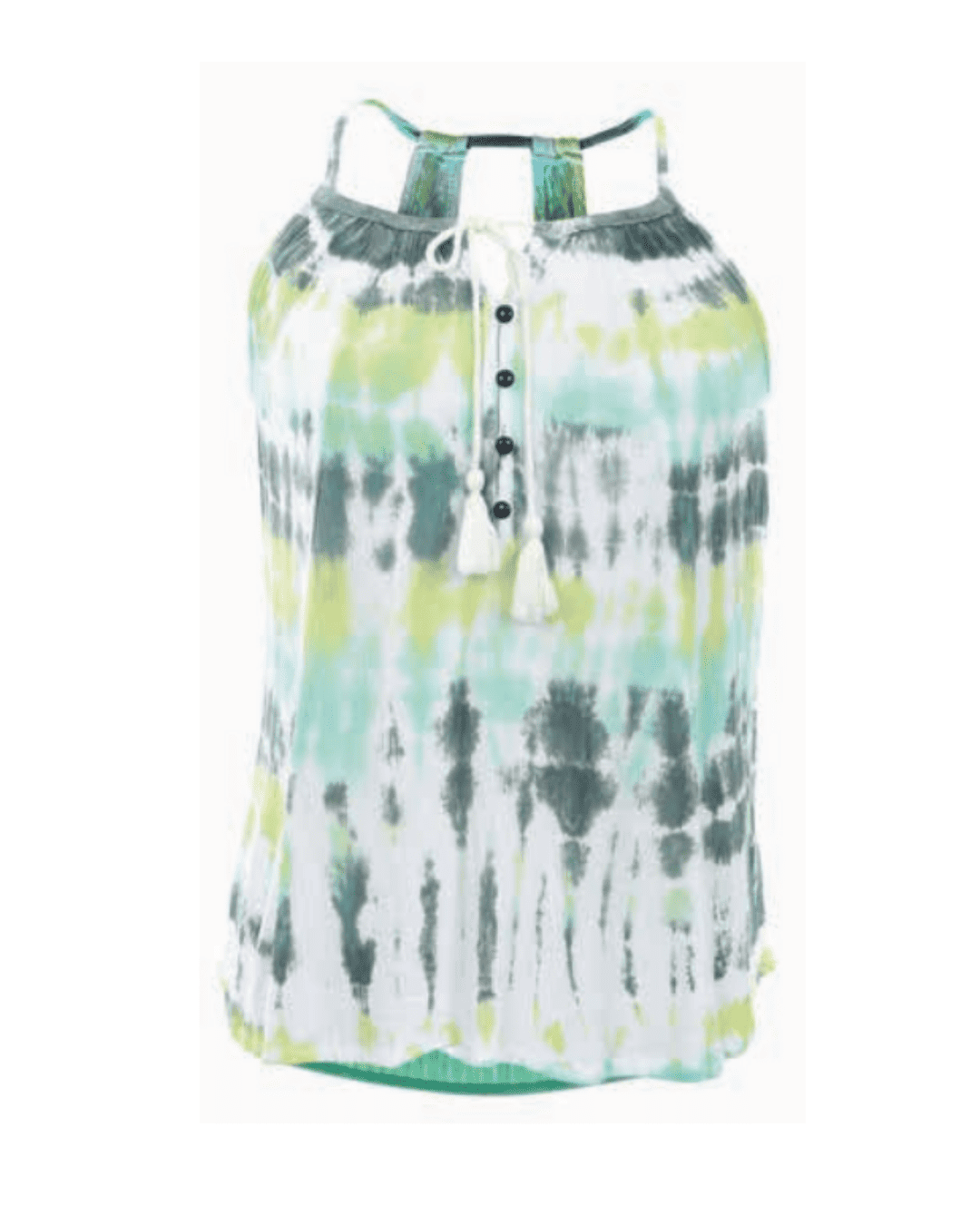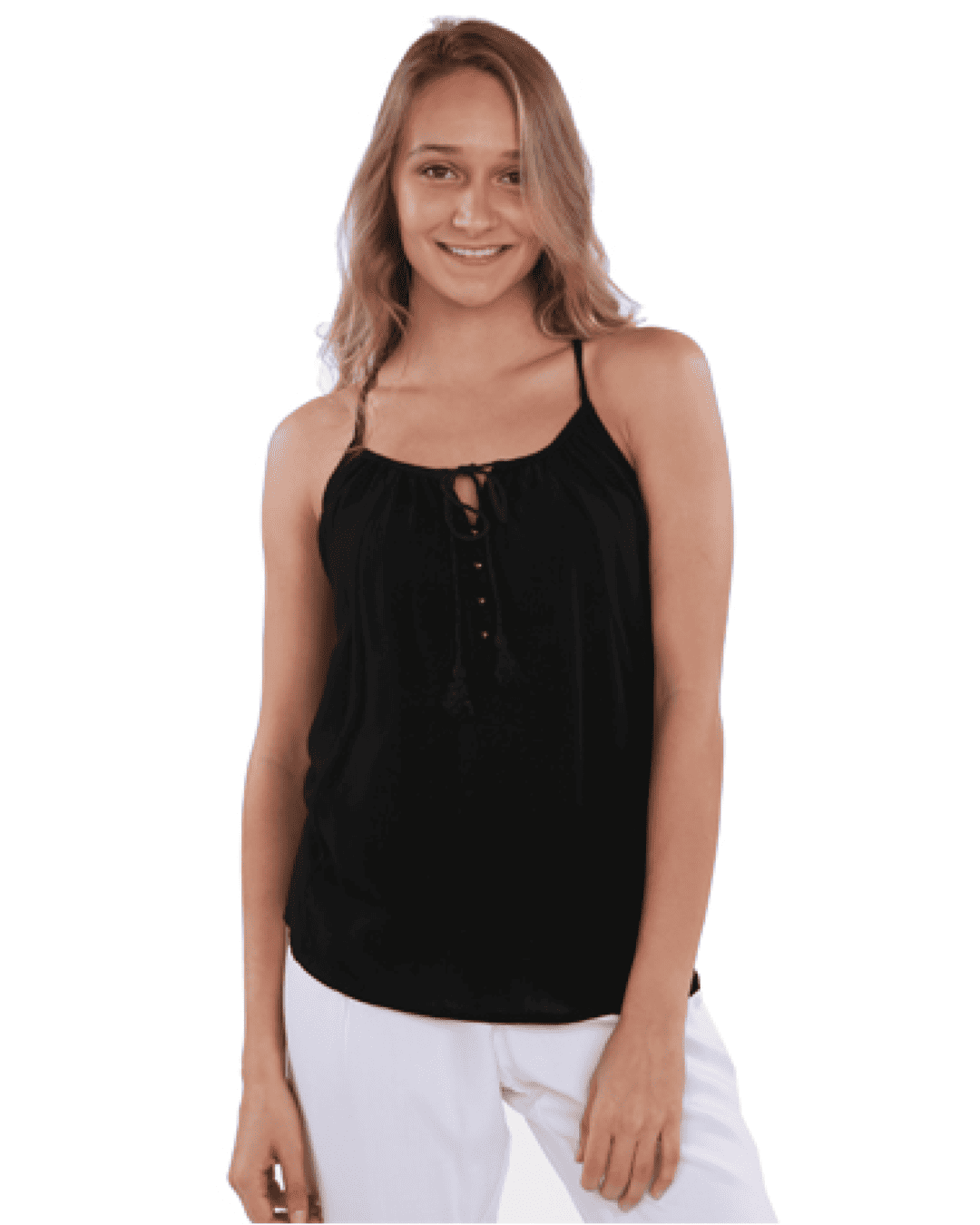 The Darling top. Cool and comfortable, this tank pairs well with any of our pants or skirts. Tie in front with tassels and button detail in front.