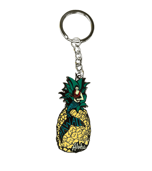 A mermaid playing her ukulele while perched upon a pineapple, with Aloha and Hawaii.