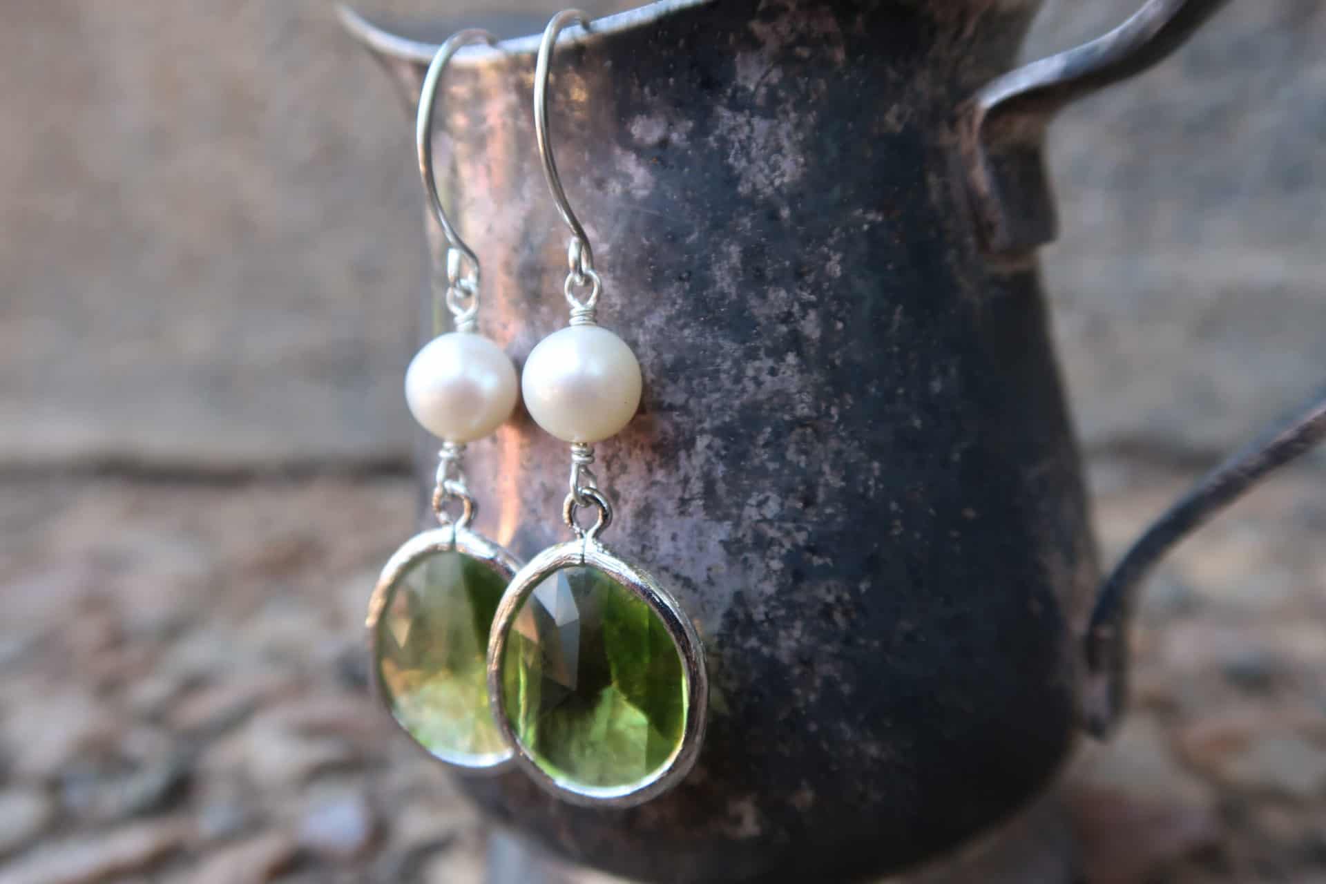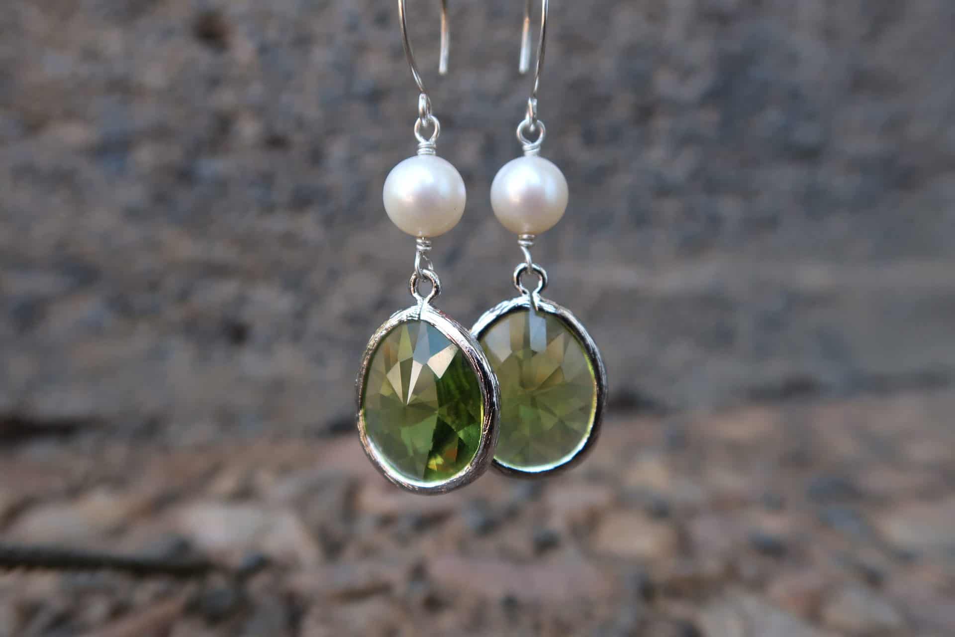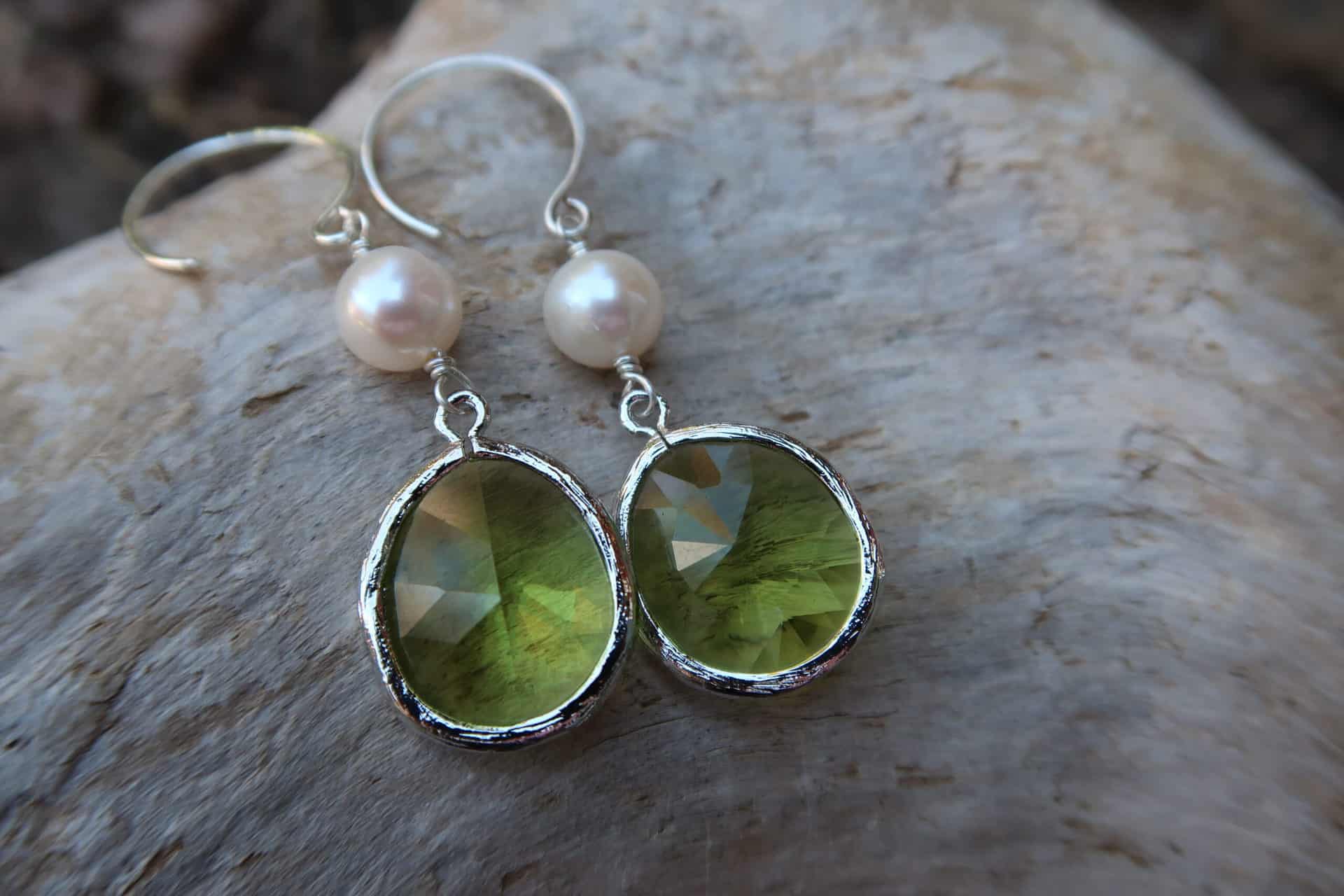 Faceted peridot green glass teardrops dangle down below white fresh water pearls on hand made sterling silver ear wires.