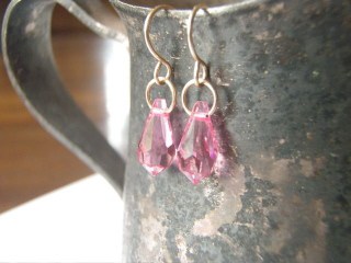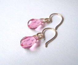 Pink Swarovski crystal drops dangle from hand made 14K gold filled ear wires.
