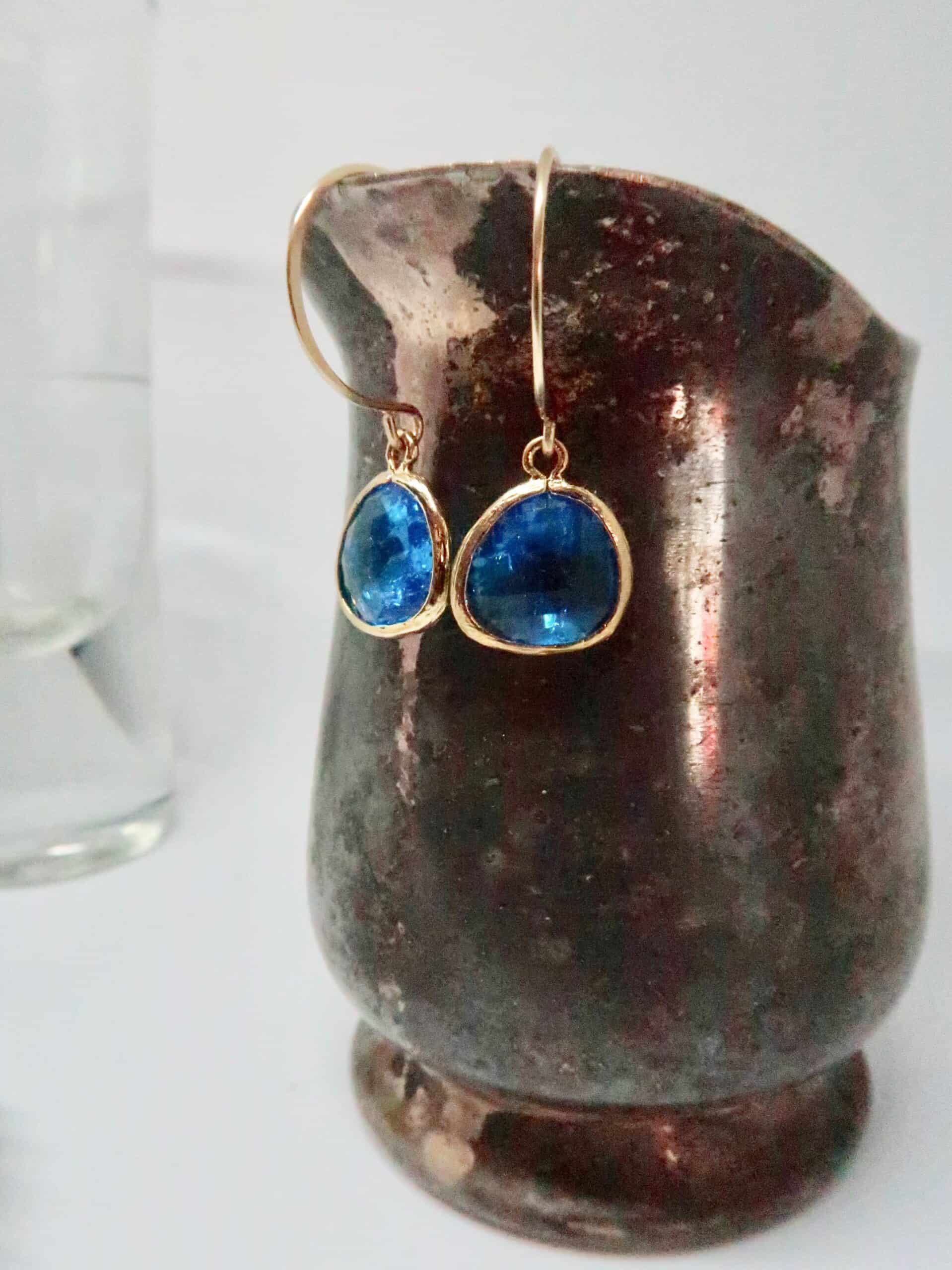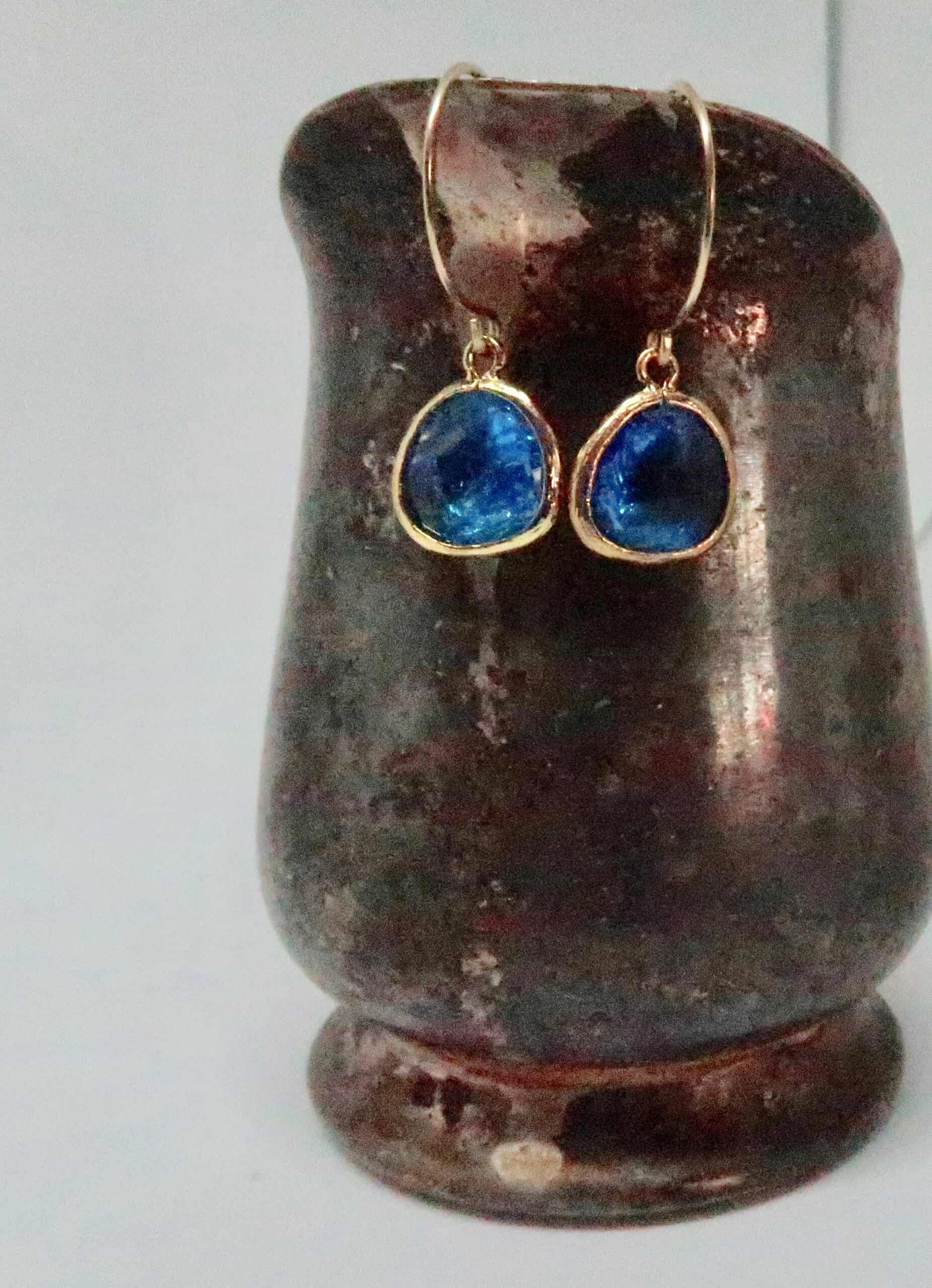 Sapphire crackle faceted glass drops dangle down from hand made 14k gold filled ear wires.