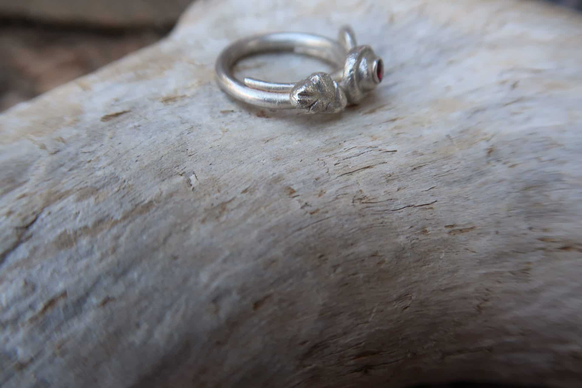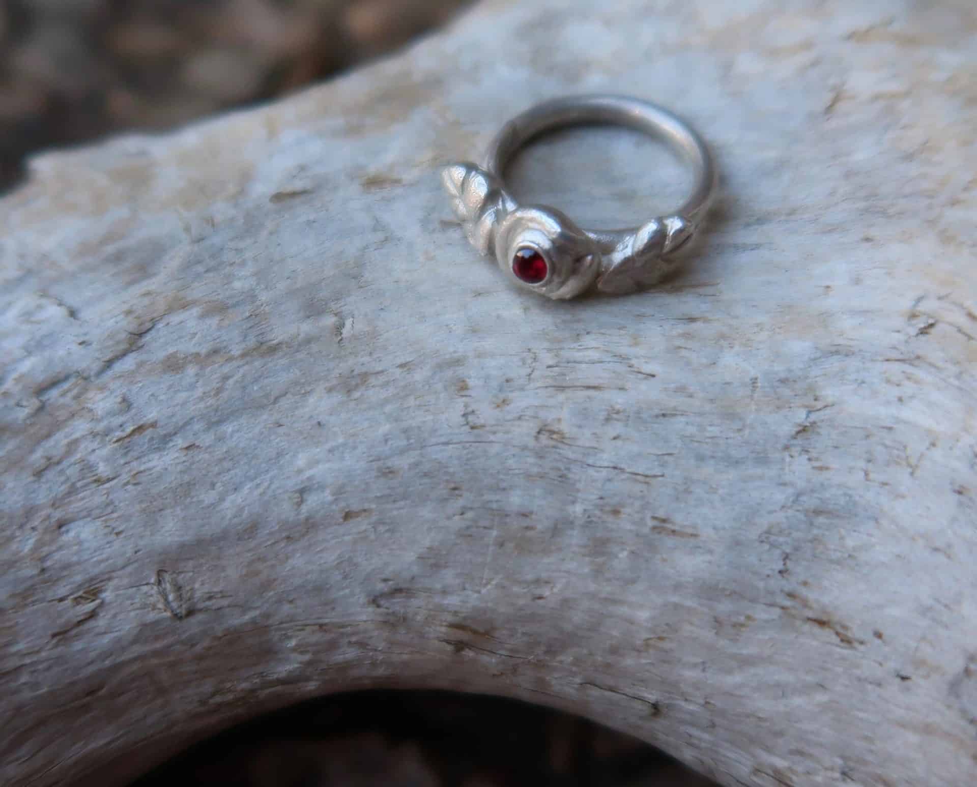 Lokelani Rose Ring with a red cubic zirconia at the center and leaf details on the sides