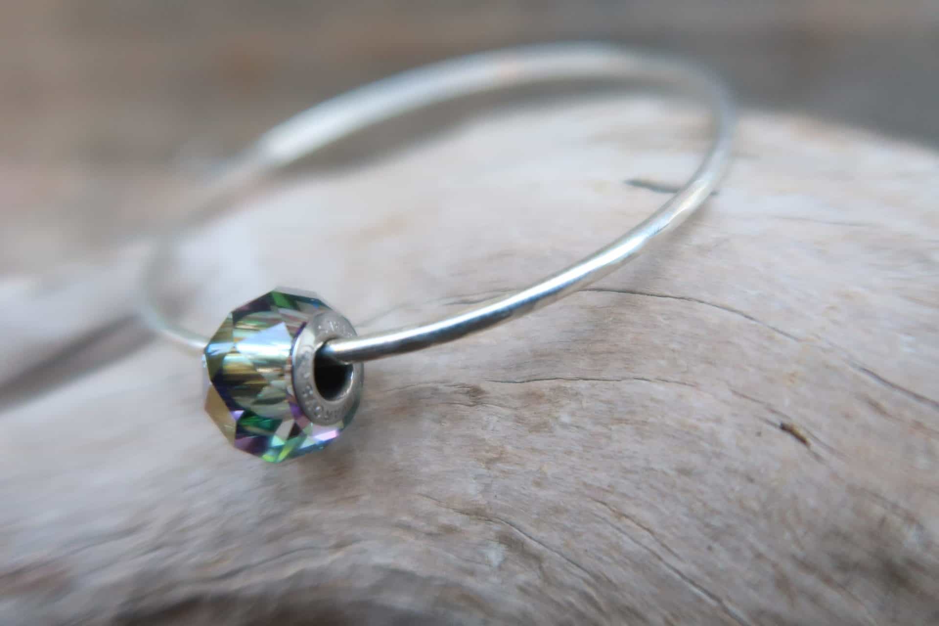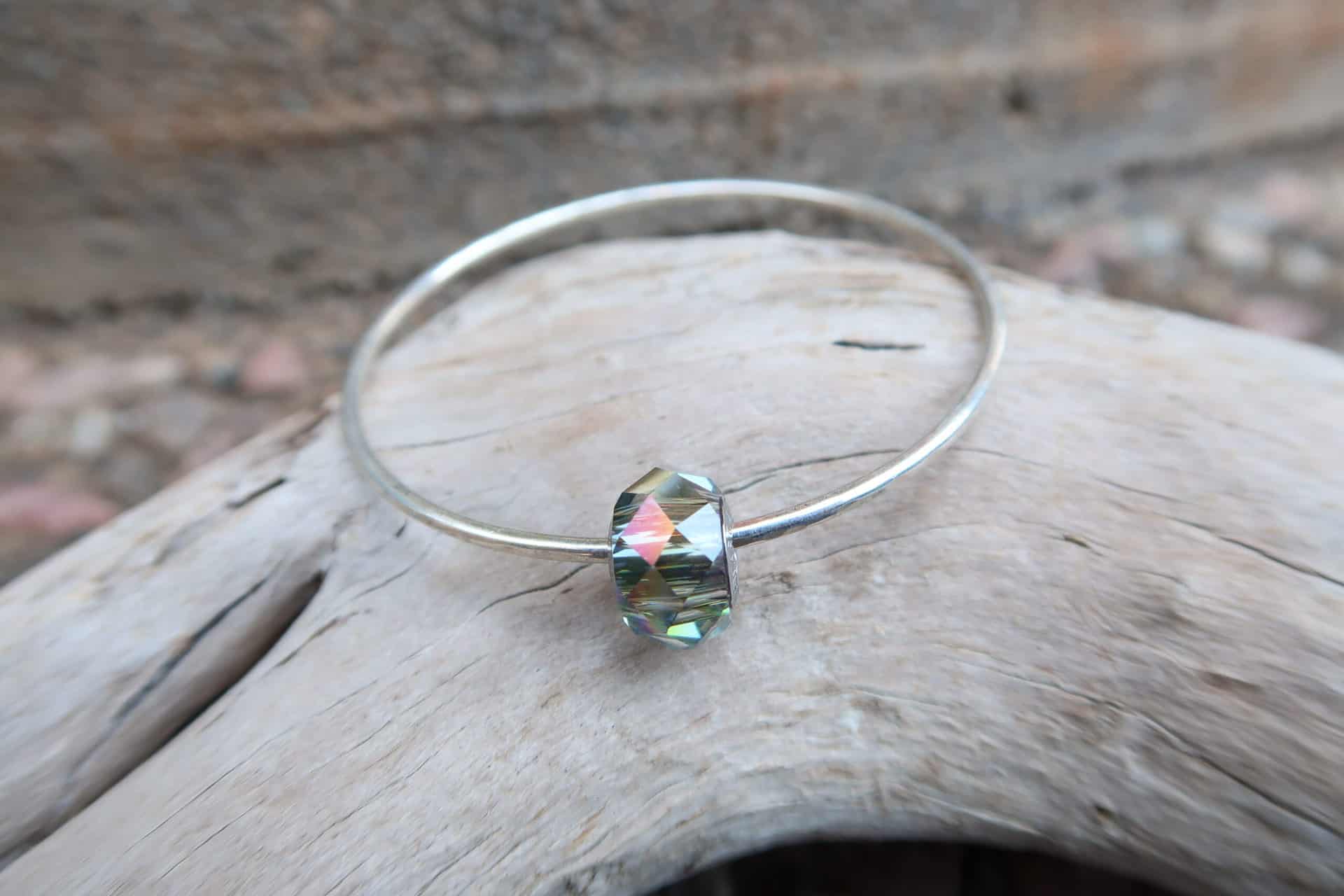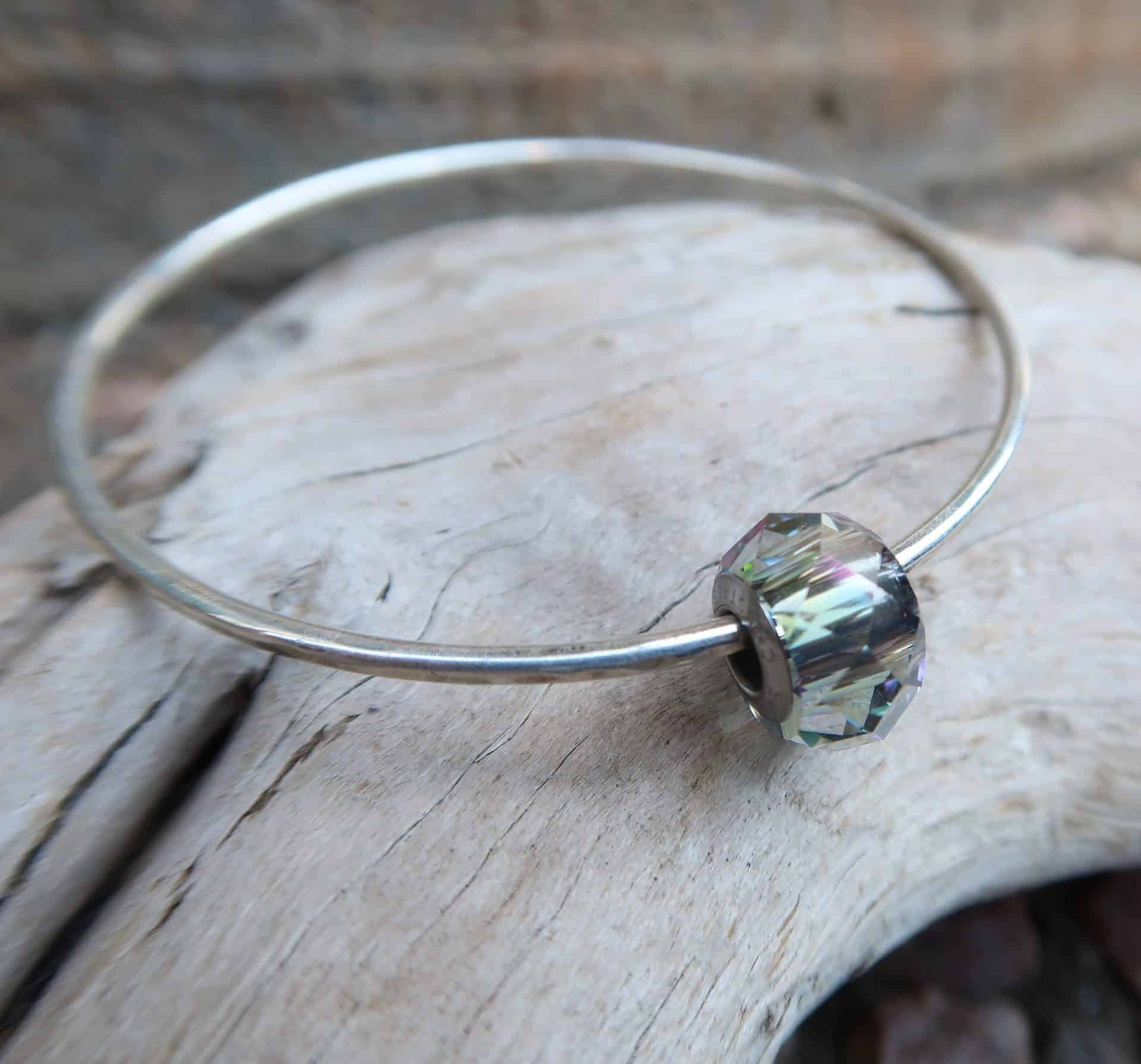 Hand forged sterling silver bangle with 1 faceted smokey Swarovski crystal spinner bead