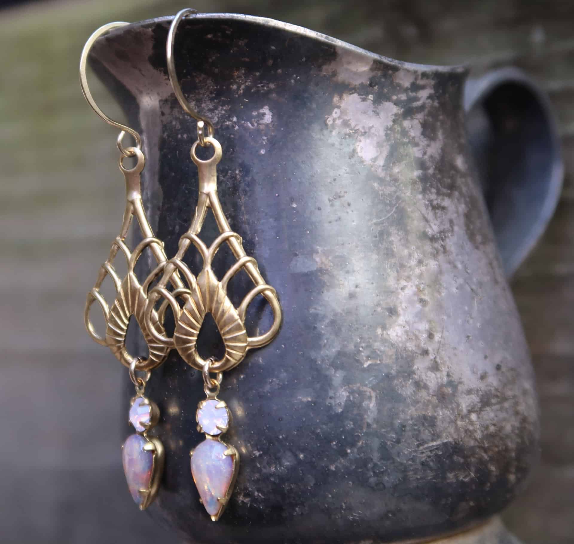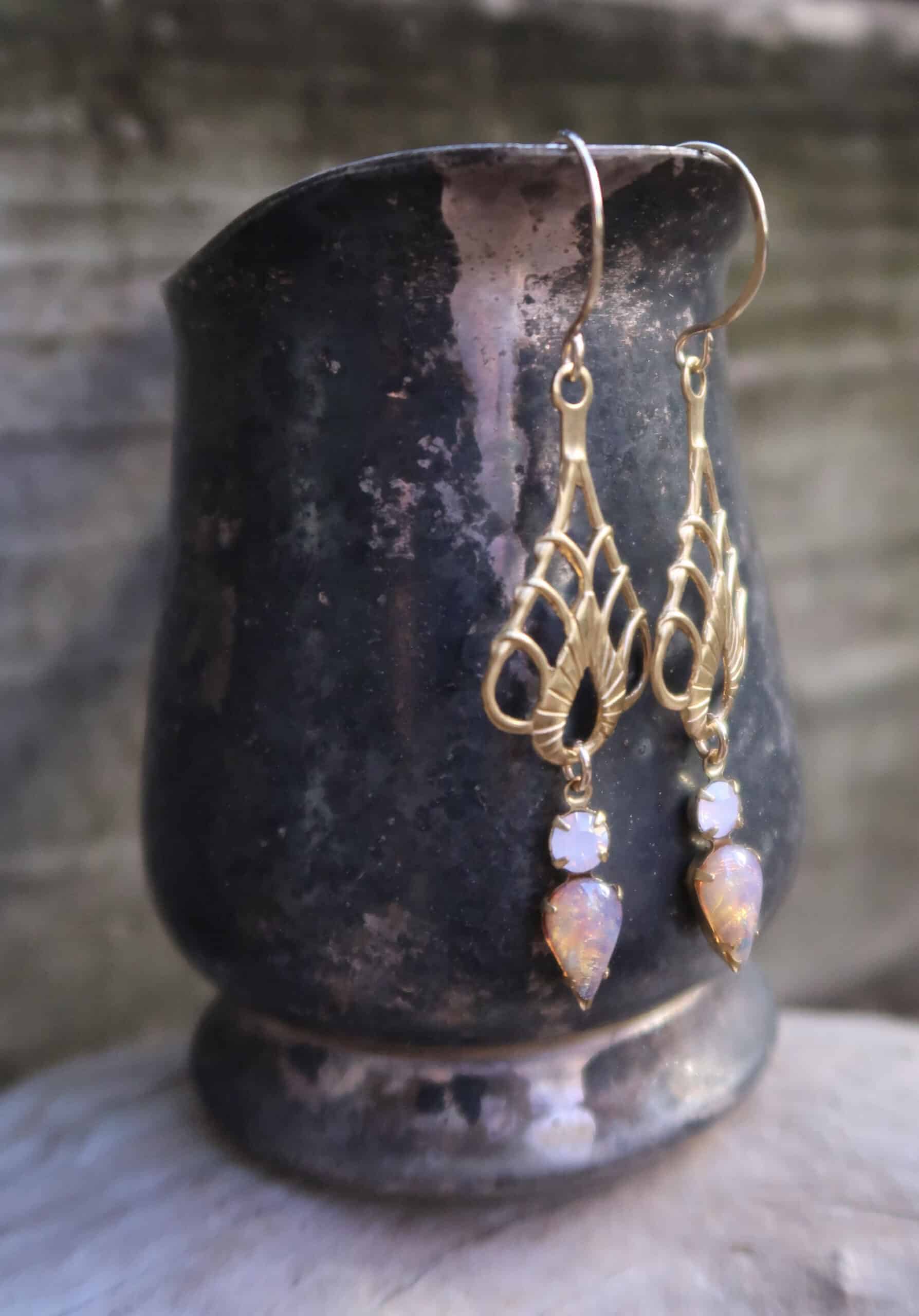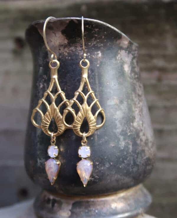 Antique rose water and fire opal rhinestones together hang down form a Victorian brass charm on hand made 14k gold filled ear wires
