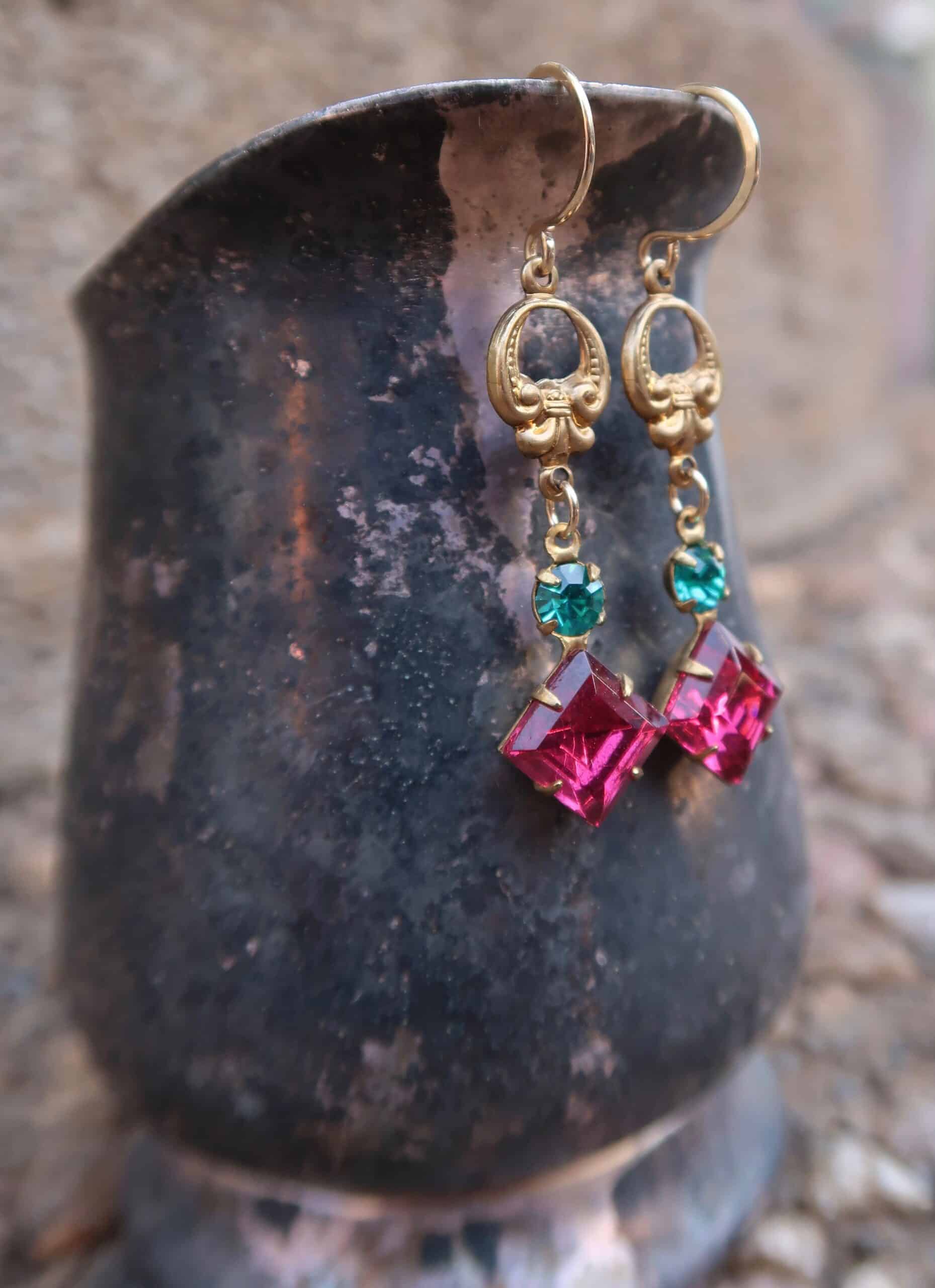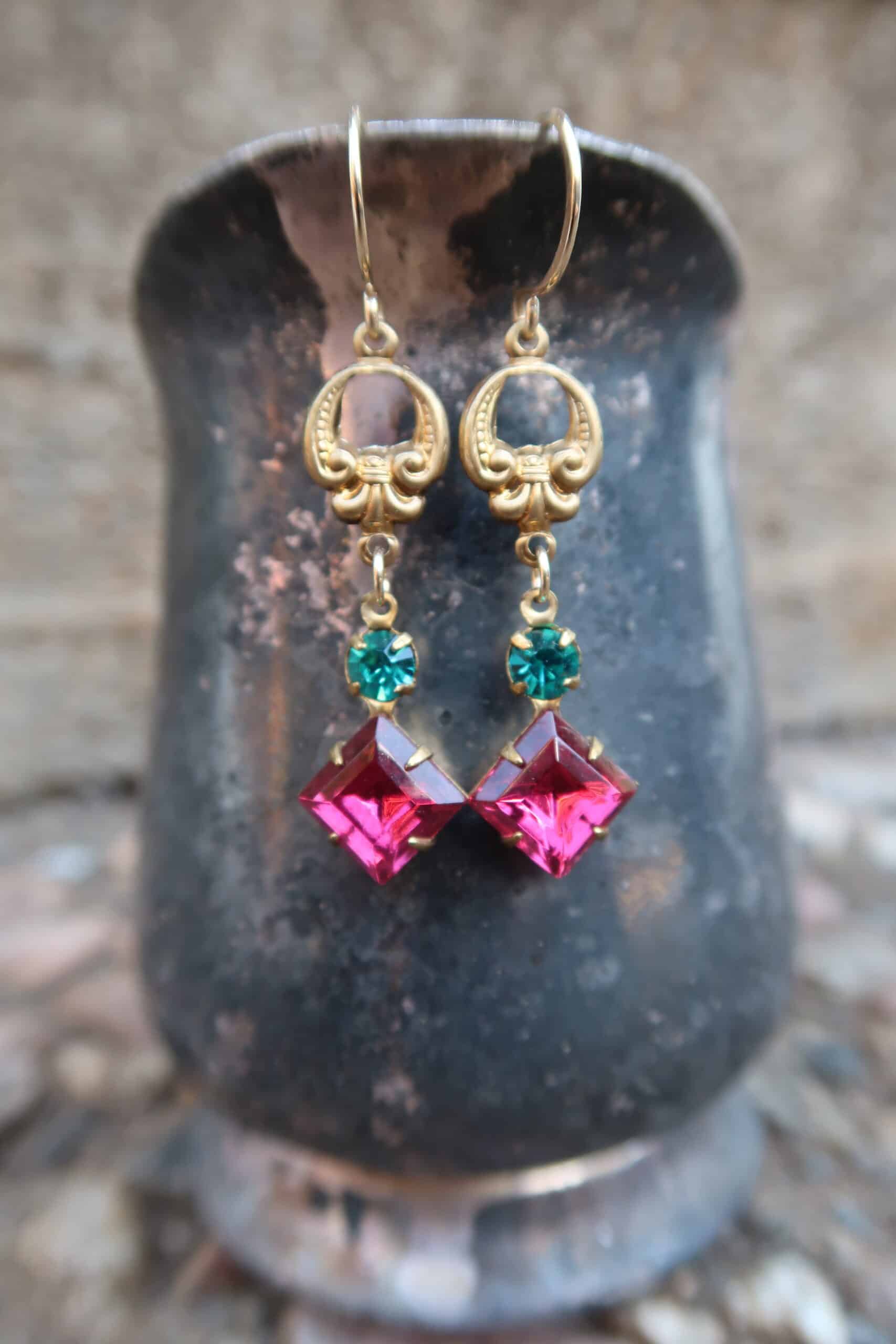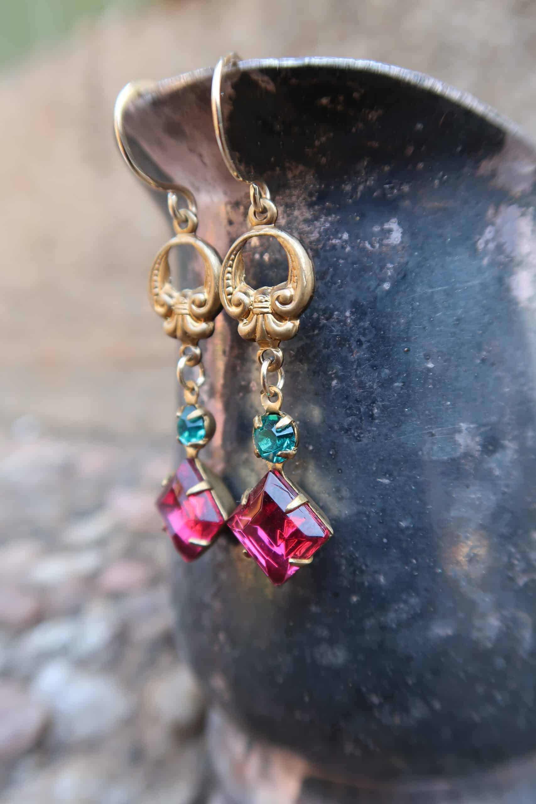 Vintage Baroque style stamped brass with vintage faceted zircon blue rhinestones & vintage faceted dark rose glass set in brass on hand made 14k gold filled ear wires
