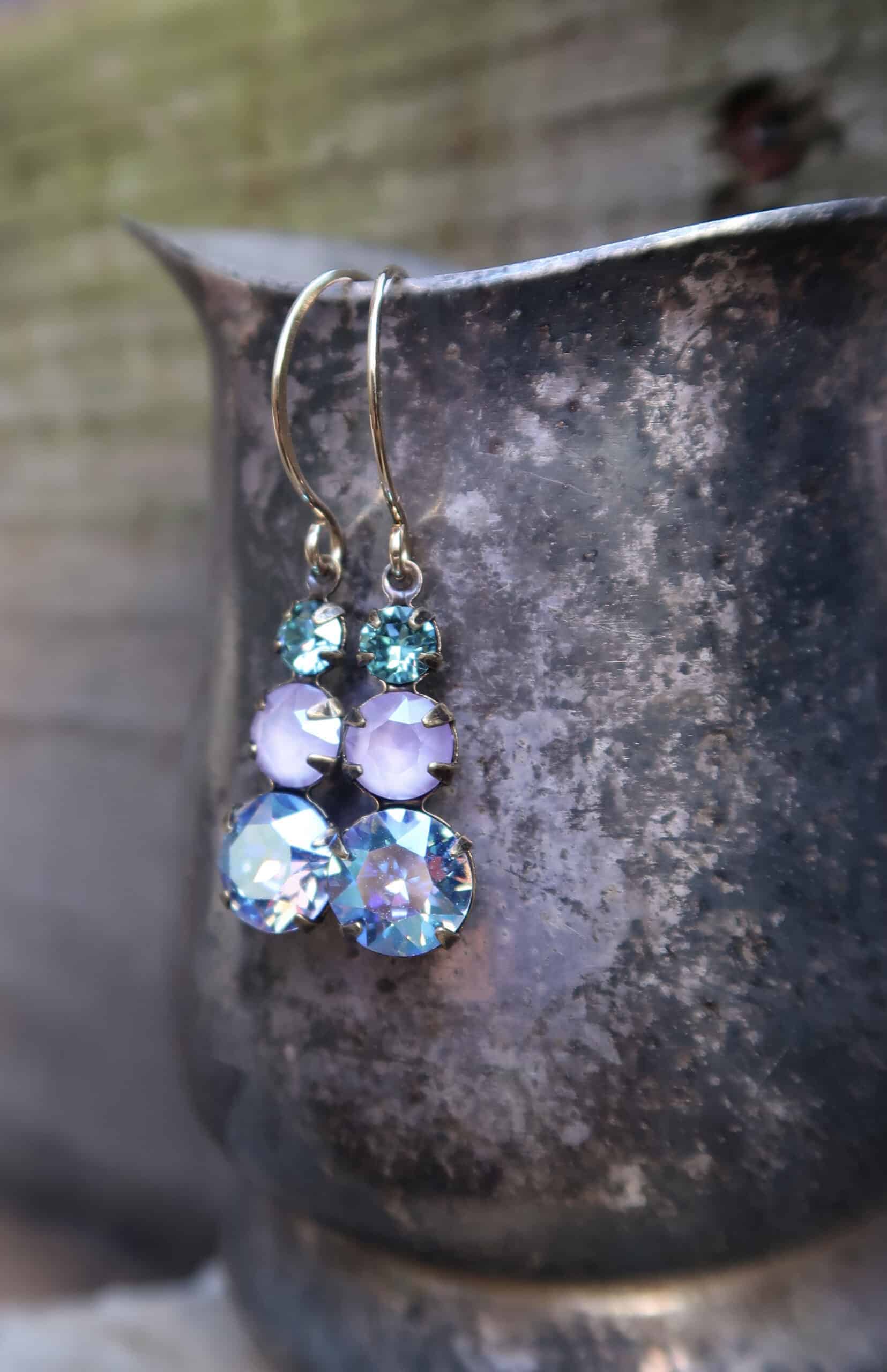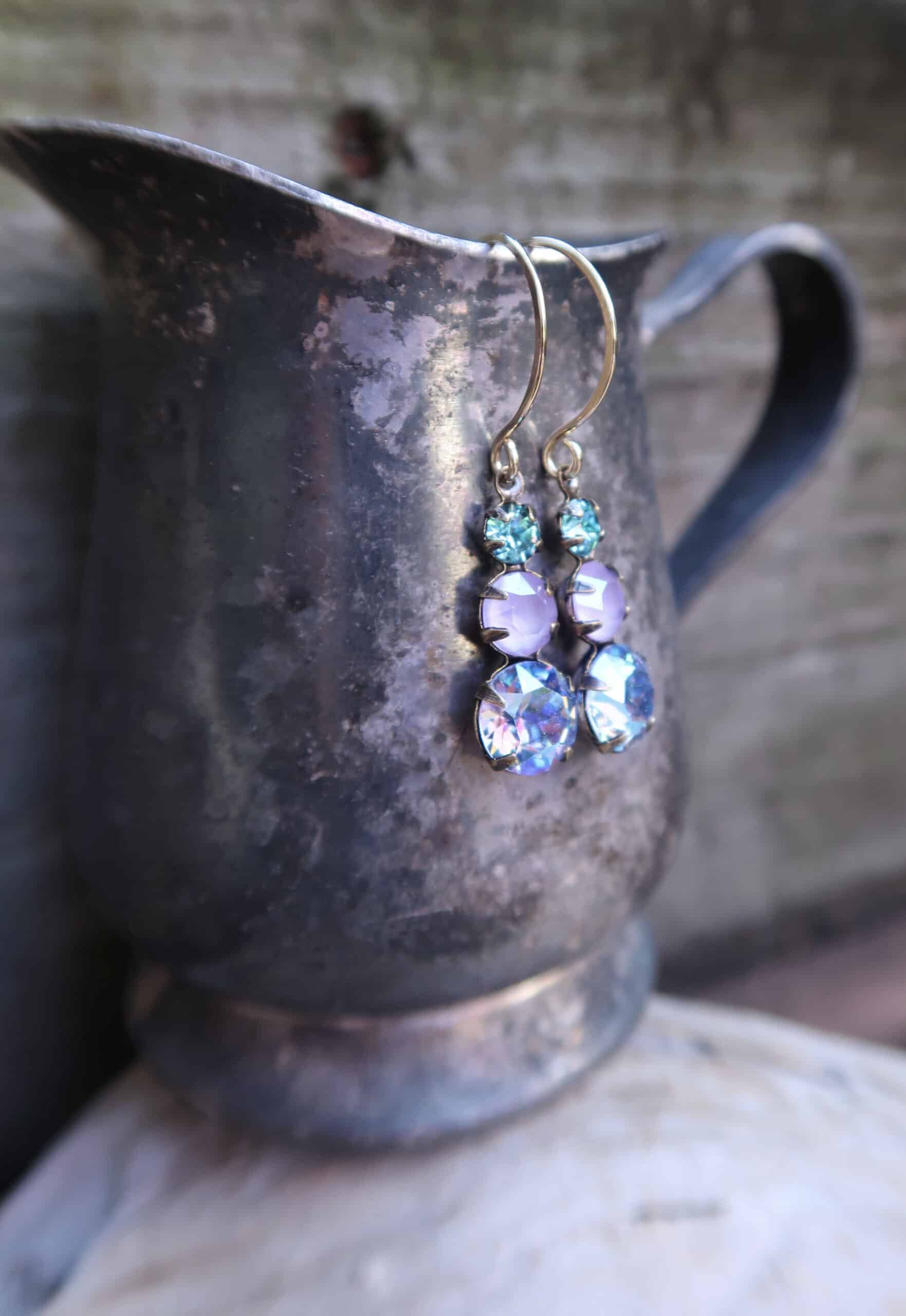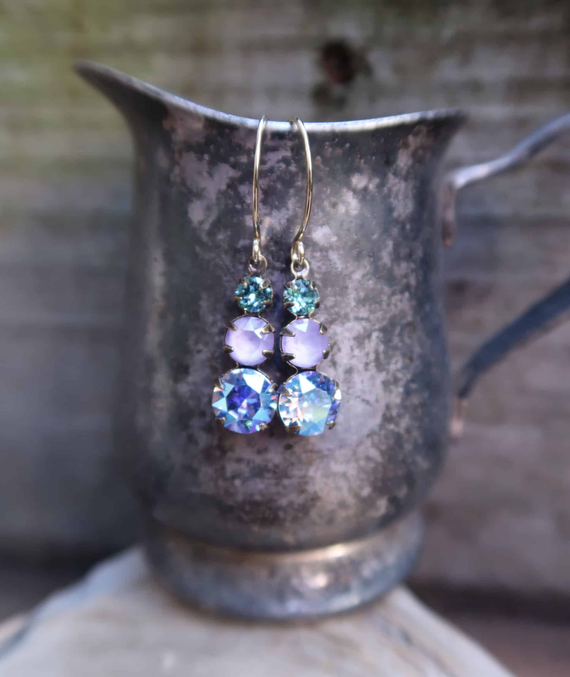 Vintage Austrian Crystals in light turquoise, lilac and light sapphire set in brass on hand made 14k gold filled ear wires