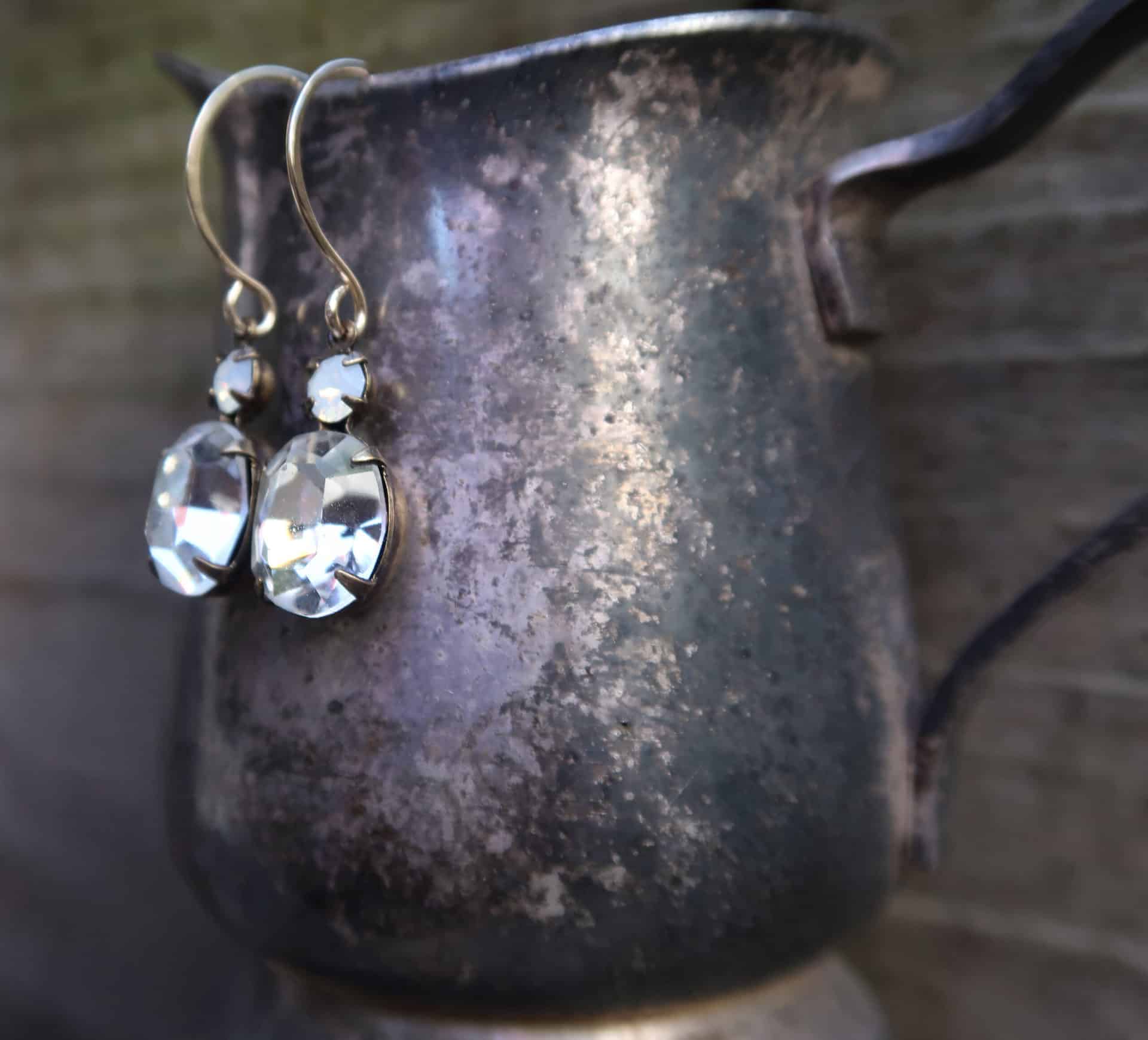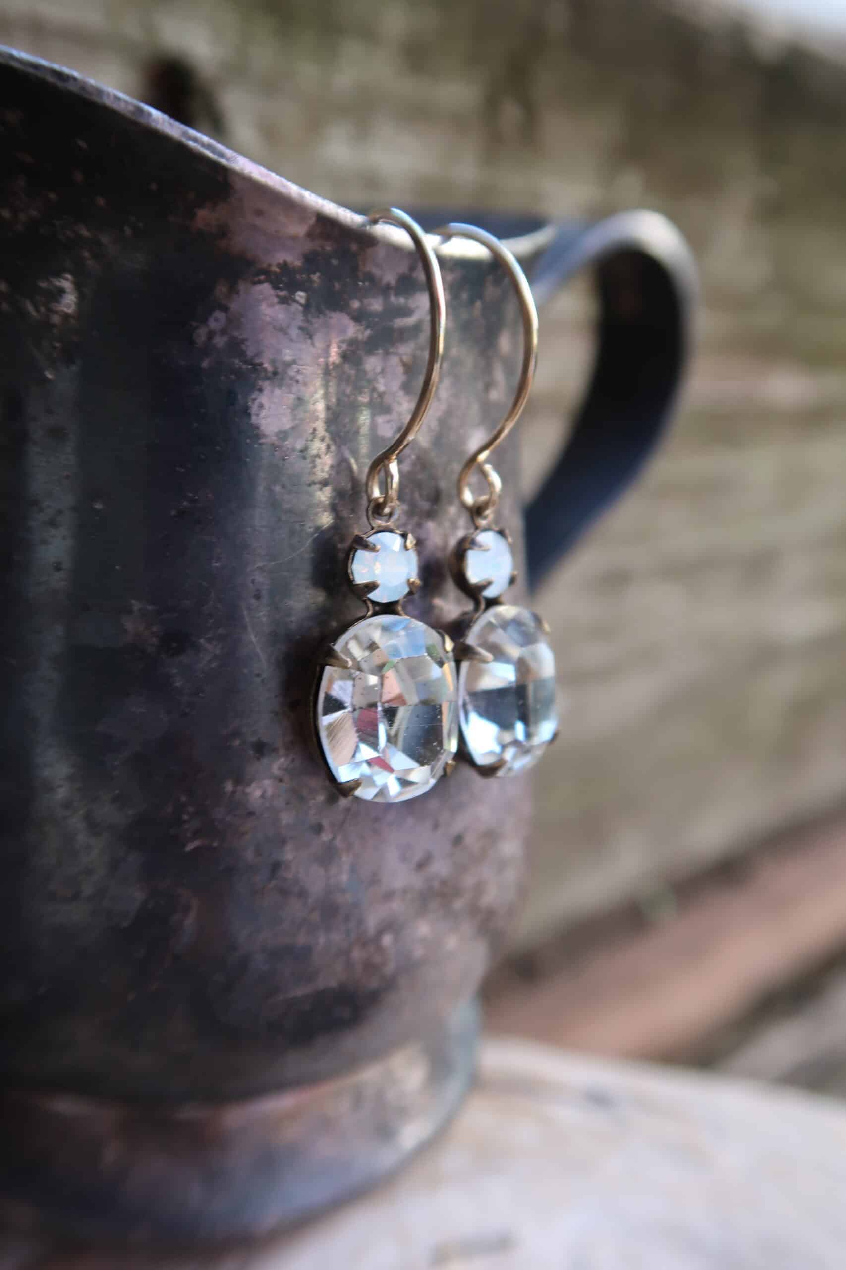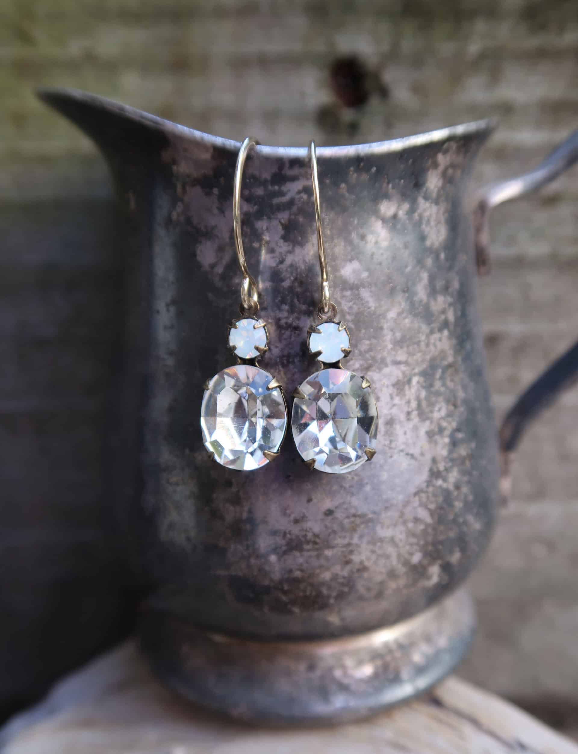 Vintage 1950's Austrian Crystals in white opal and crystal on hand made sterling silver ear wires