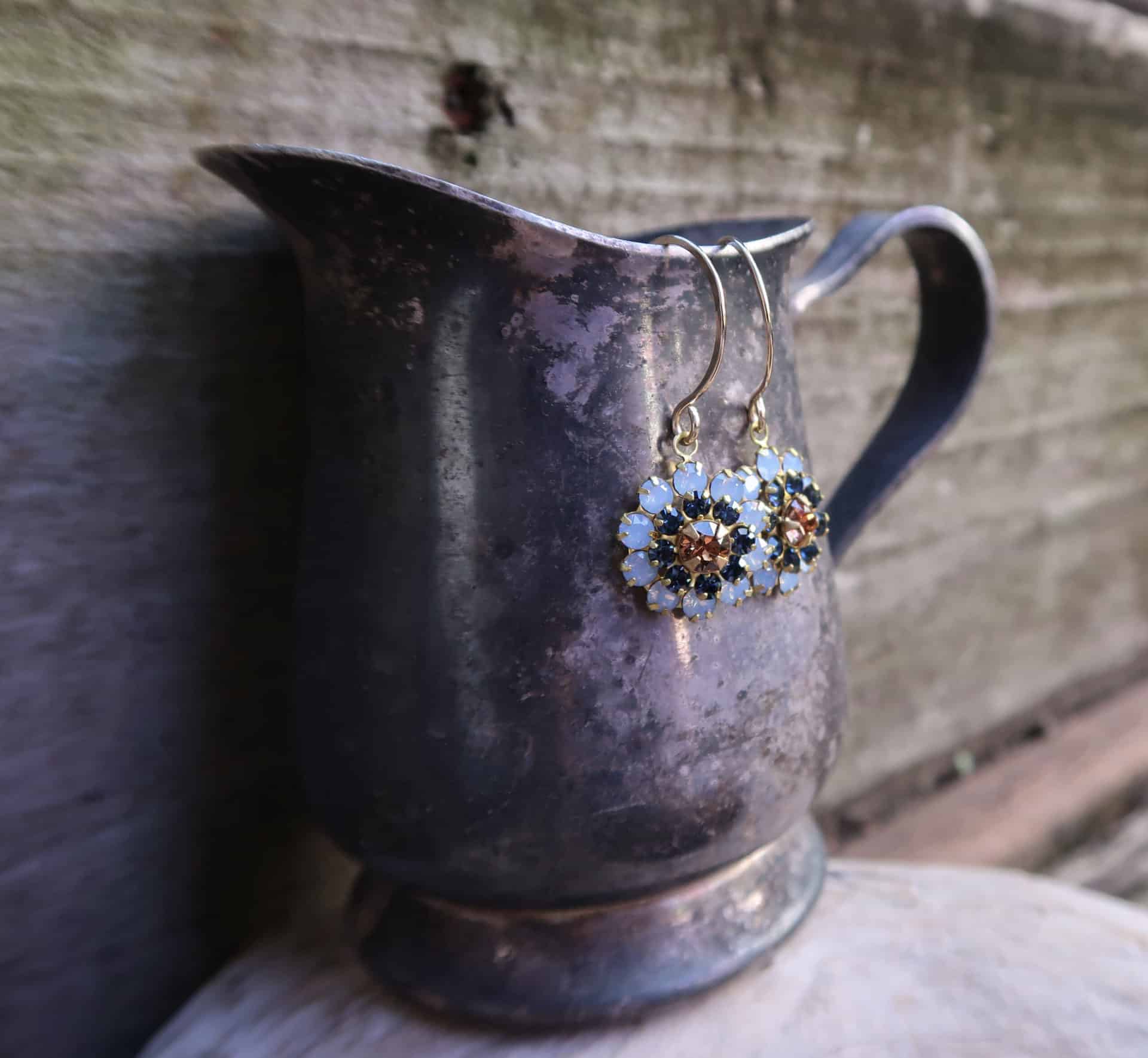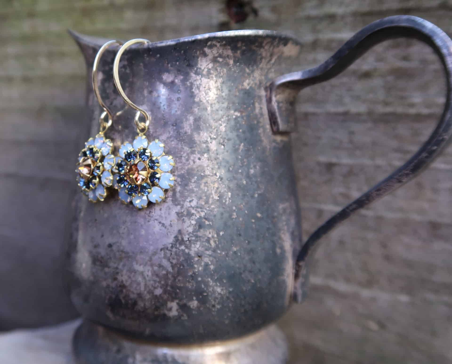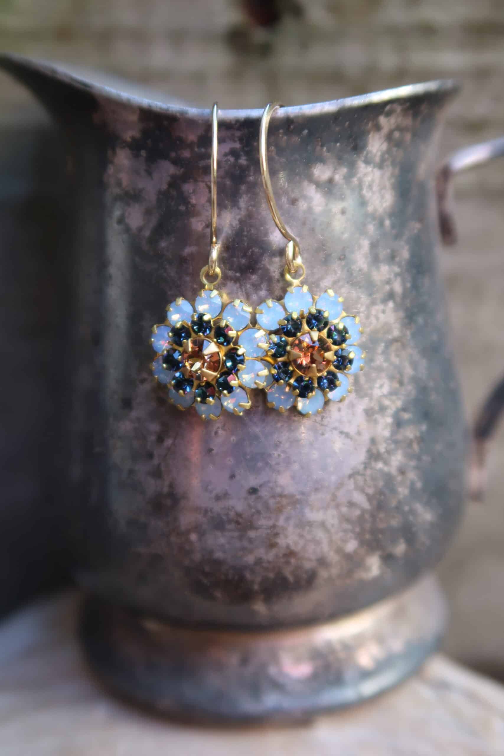 Vintage Swarovski Crystal Flower in Blue Opal, Montana Blue & Light Smoked Topaz set in brass on hand made gold filled ear wires