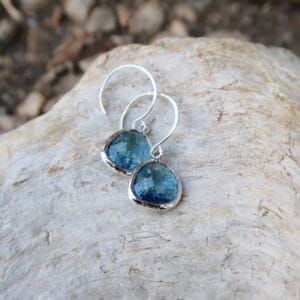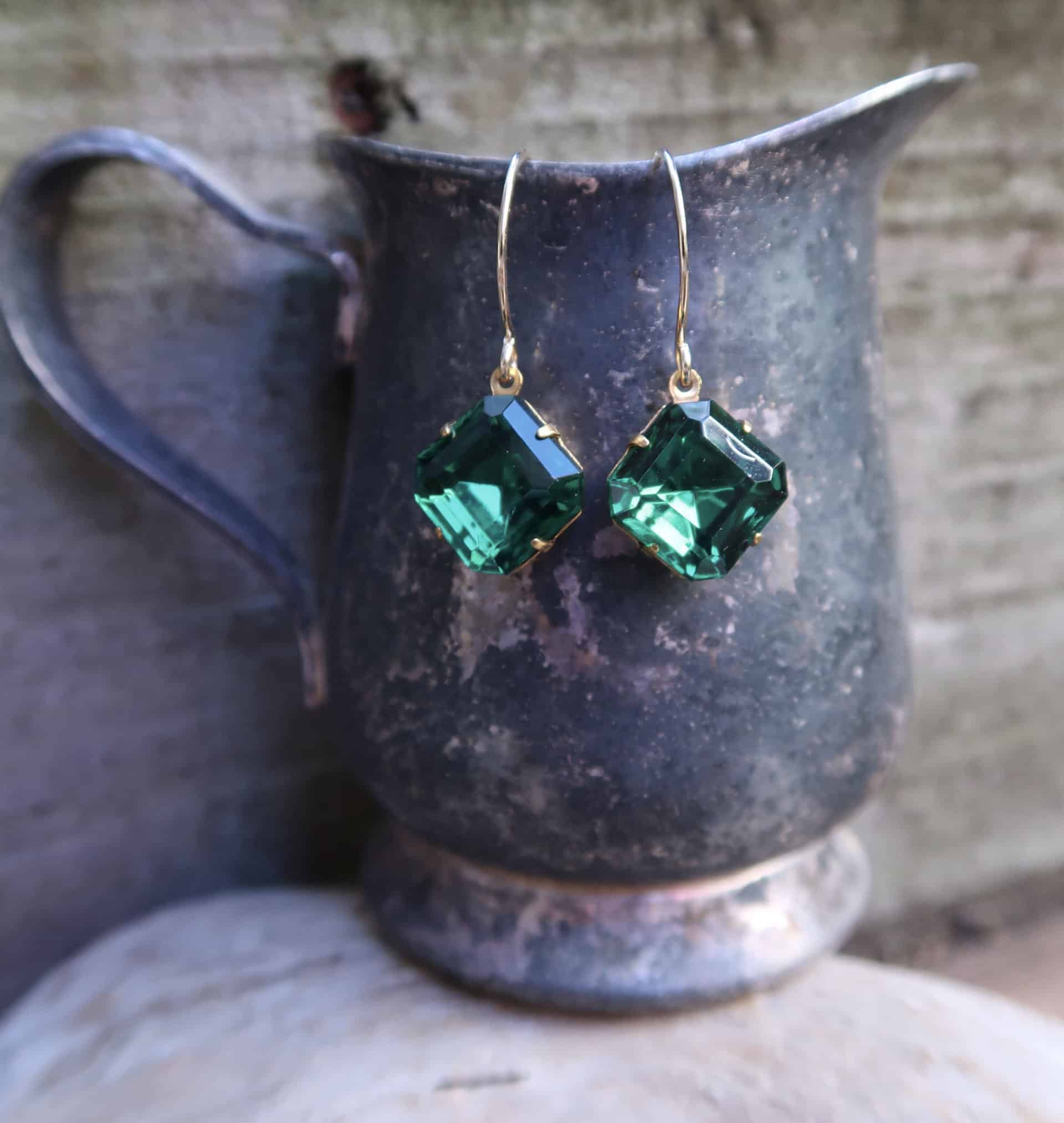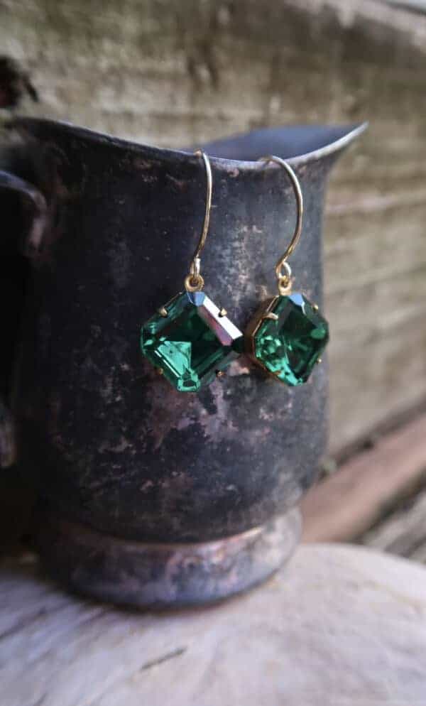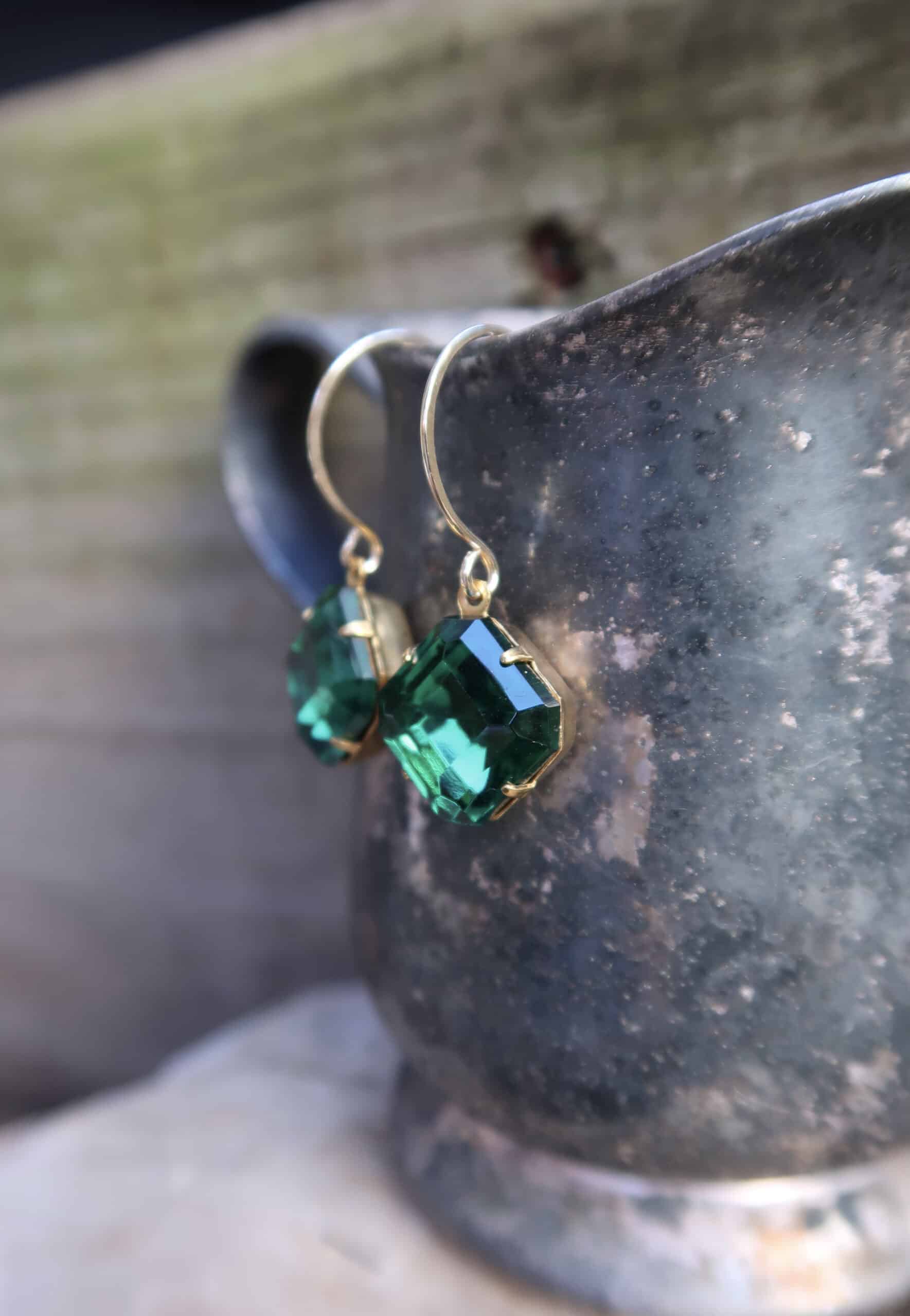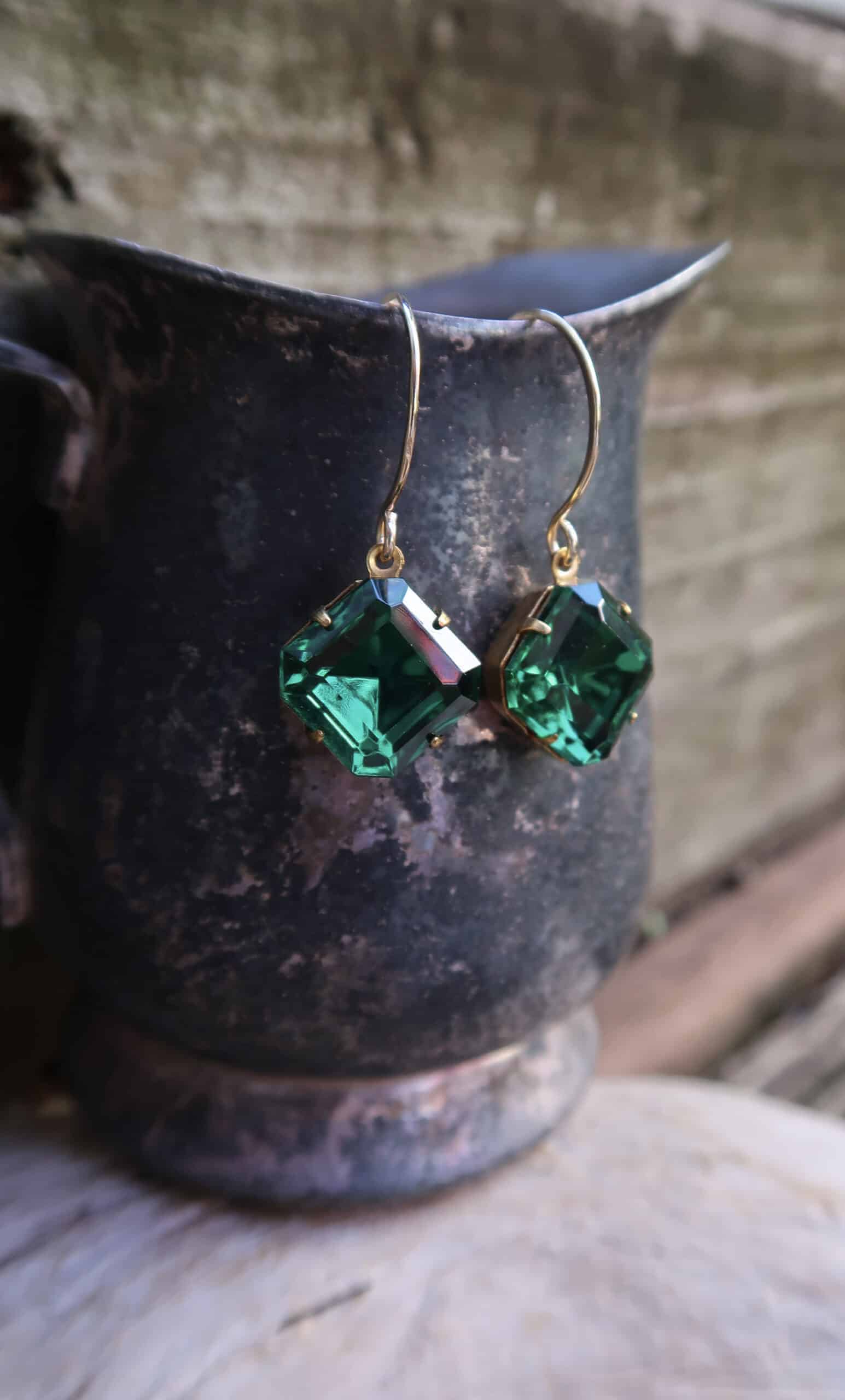 Beautiful vintage faceted emerald glass square from the Czech Republic on hand made 14k gold filled ear wires