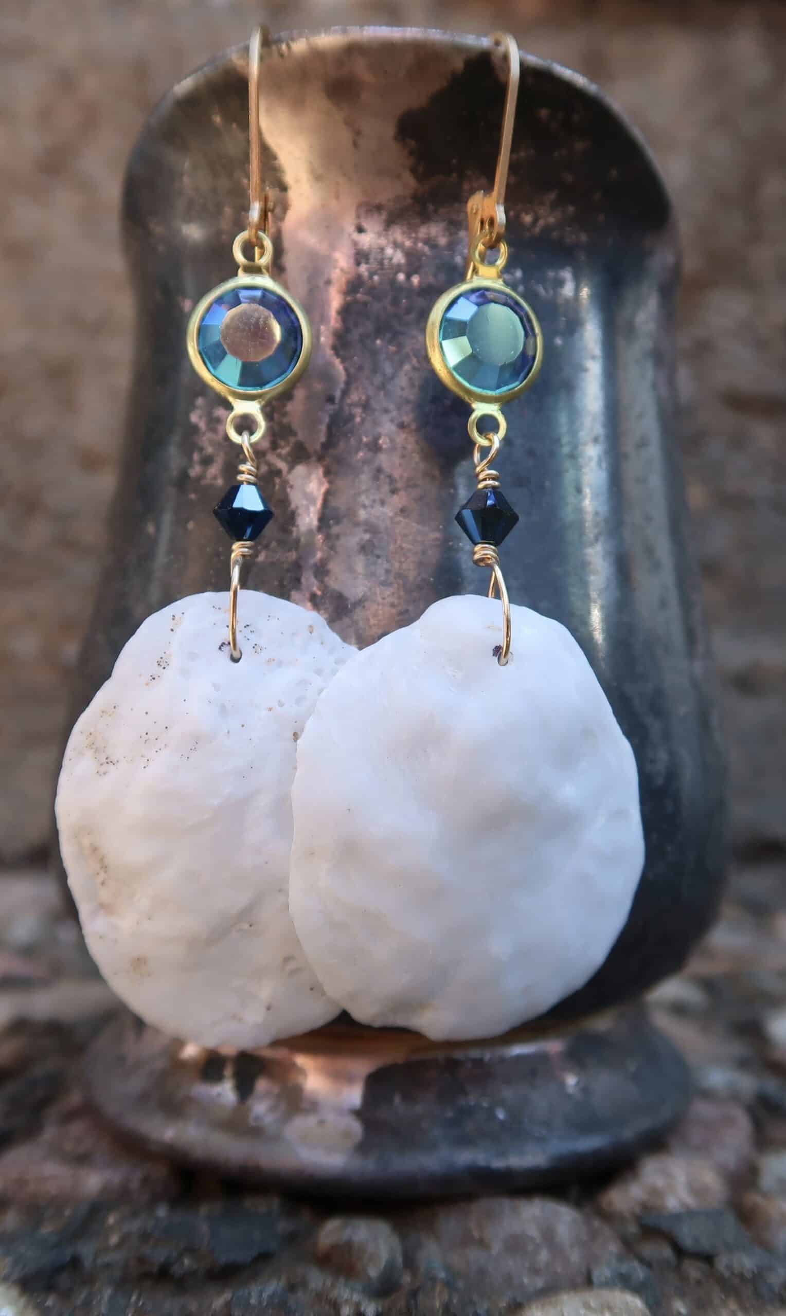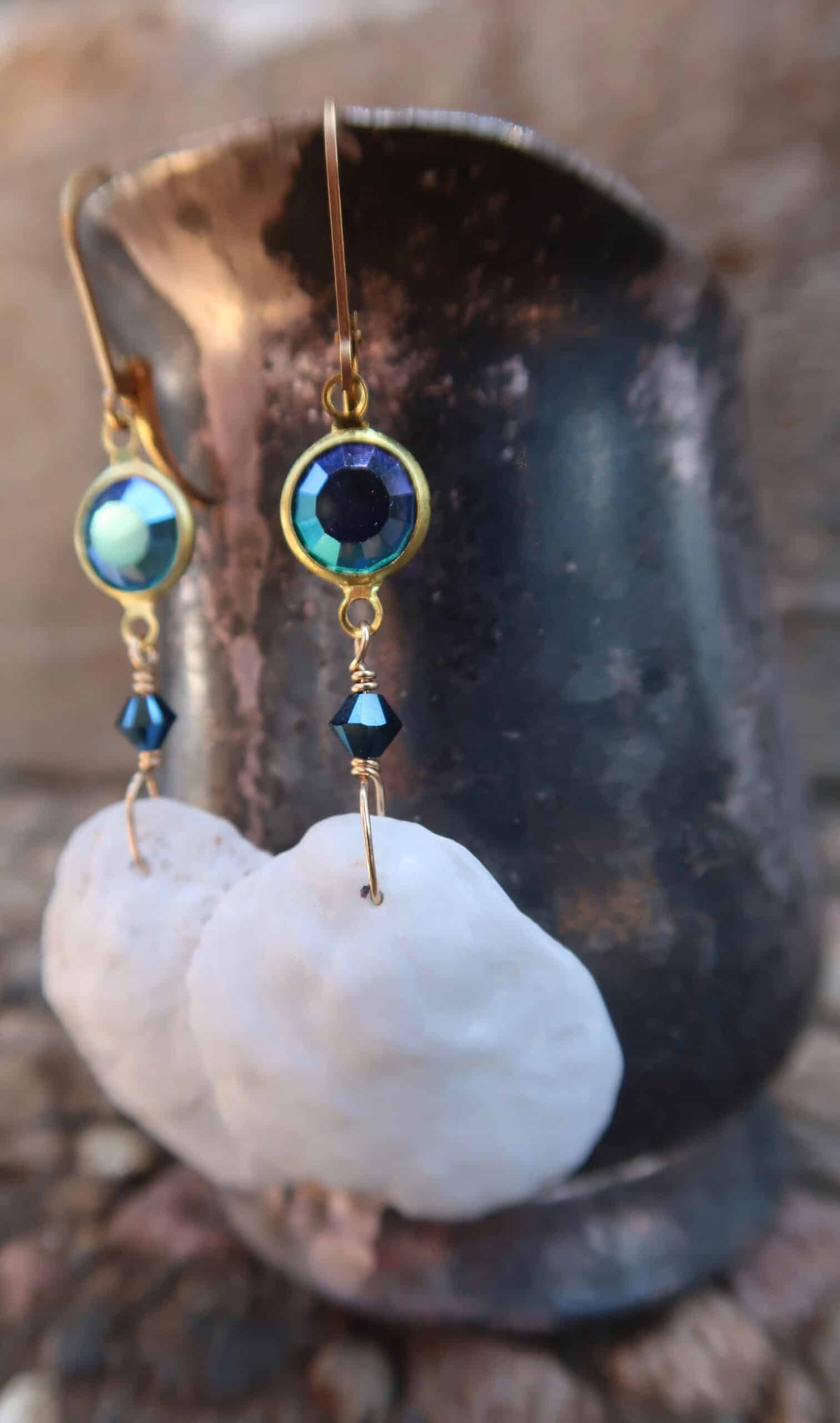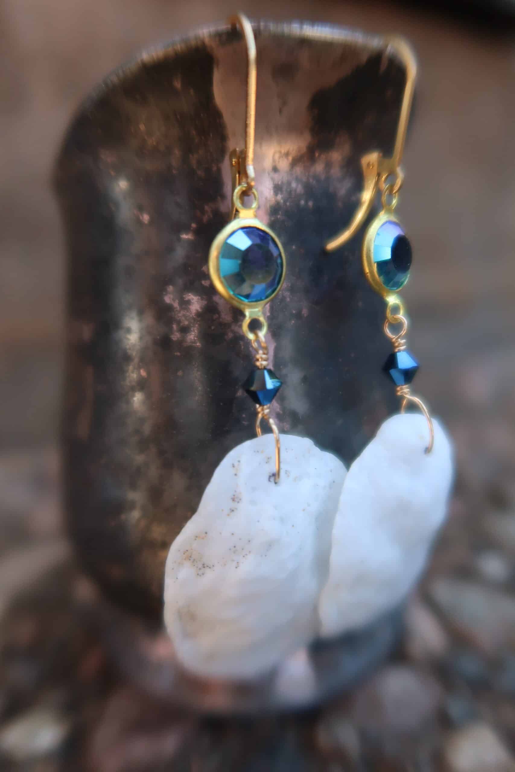 A Hawaiian Shell dangles down below vintage Montana blue faceted Swarovski crystal set in brass and Montana blue Swarovski crystal bead on 14k gold filled lever back earrings