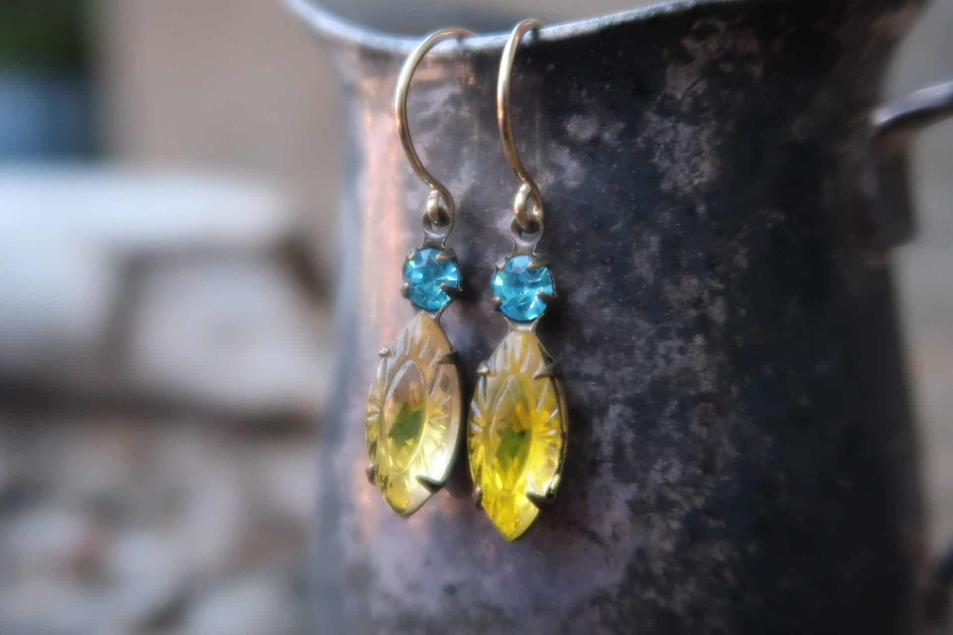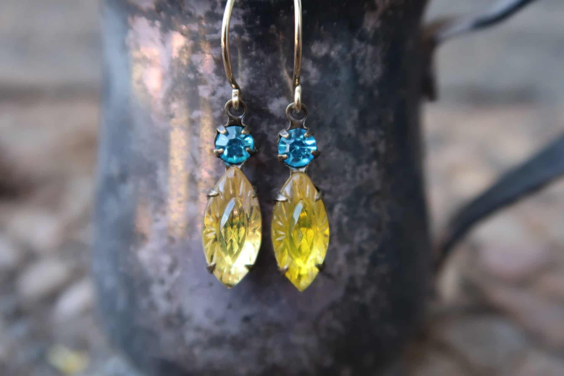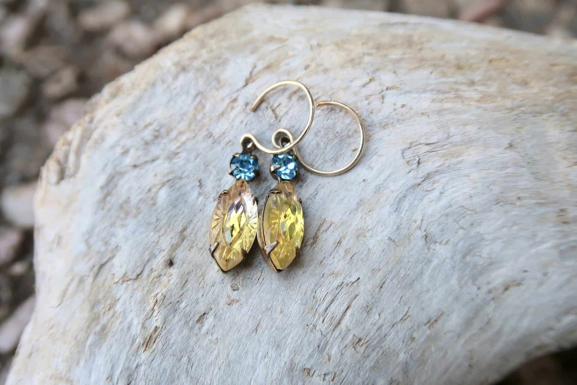 Vintage round light blue rhinestone on top and lemon yellow navette etched with a star burst below set in brass on hand made 14k gold filled ear wires.