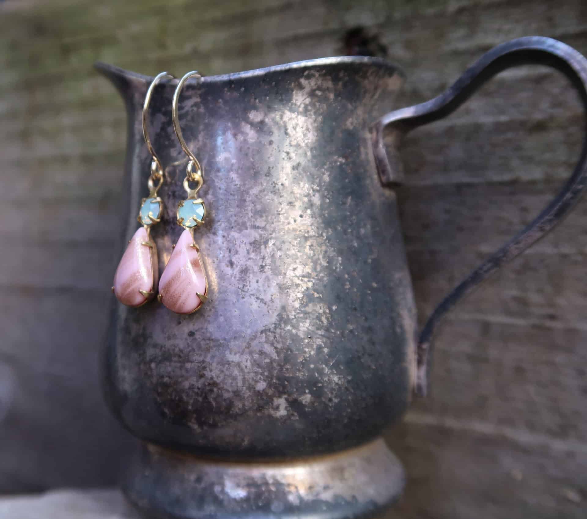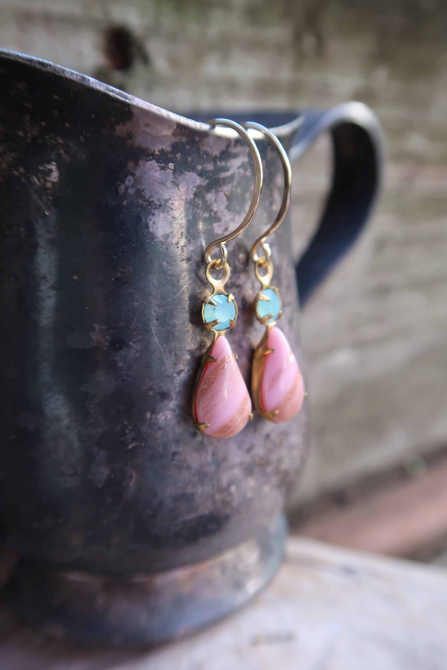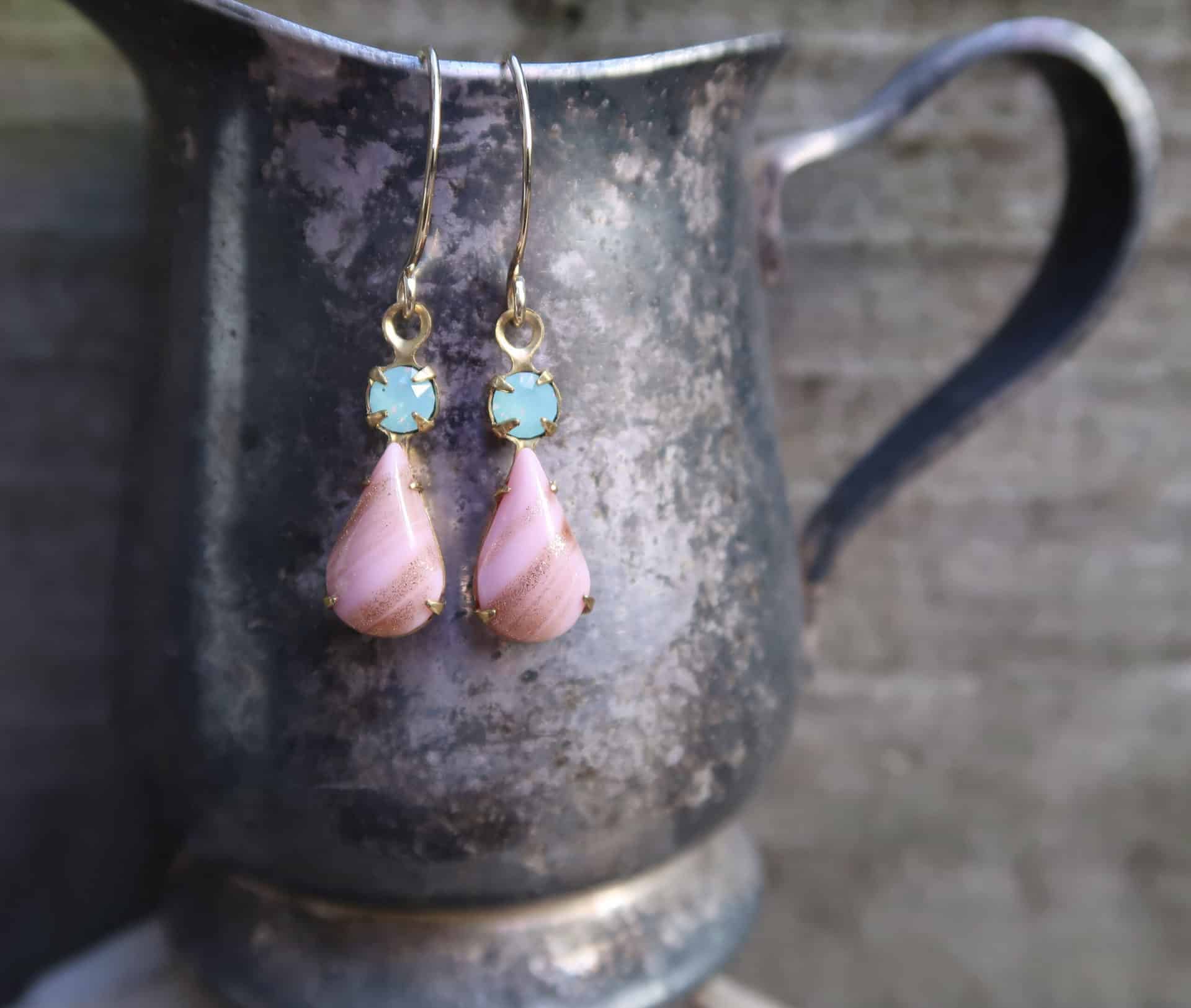 A beautiful vintage faceted glass pacific opal above with vintage glass pink with copper swirl below set in brass on hand made 14k gold filled ear wires.
