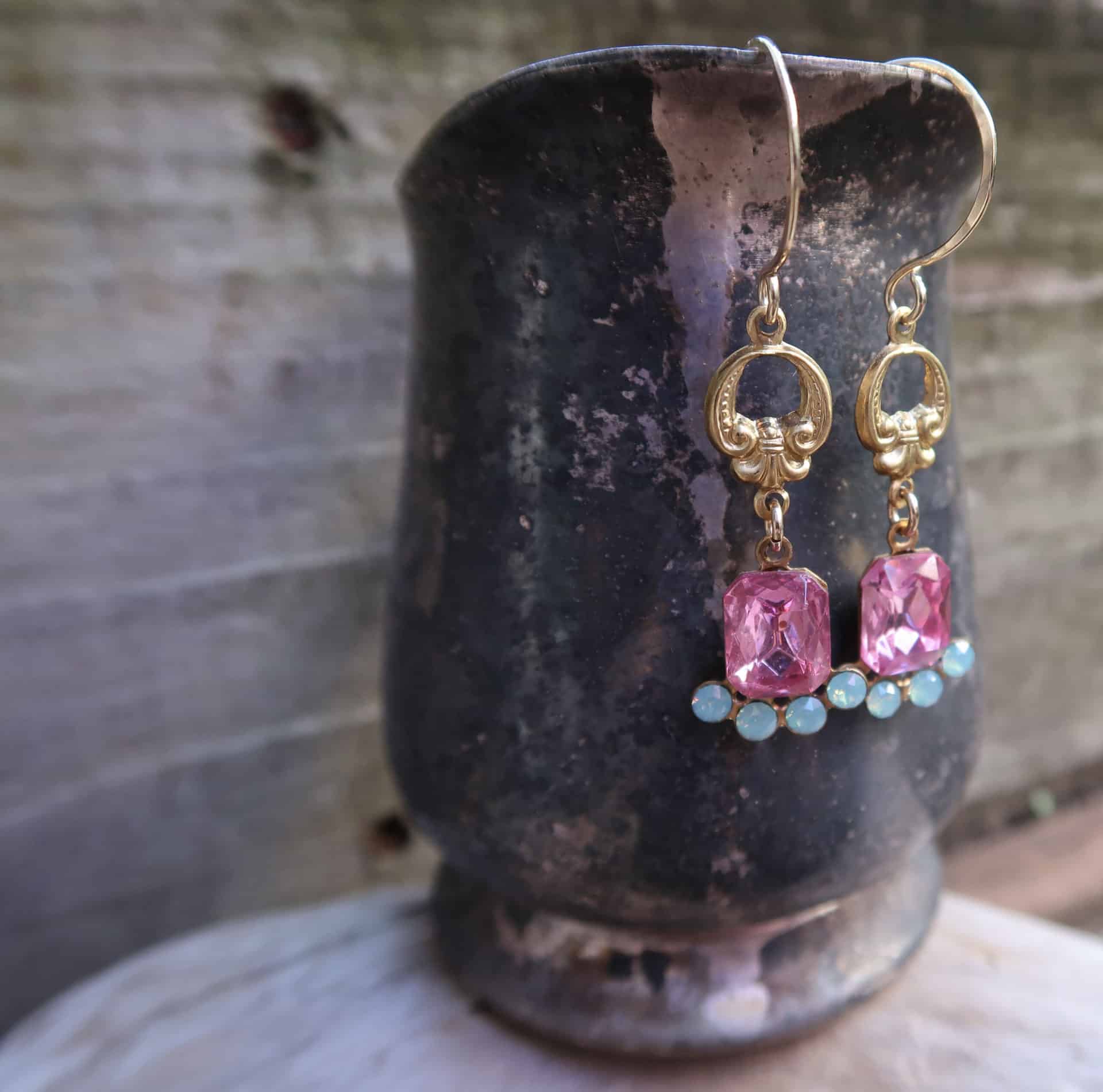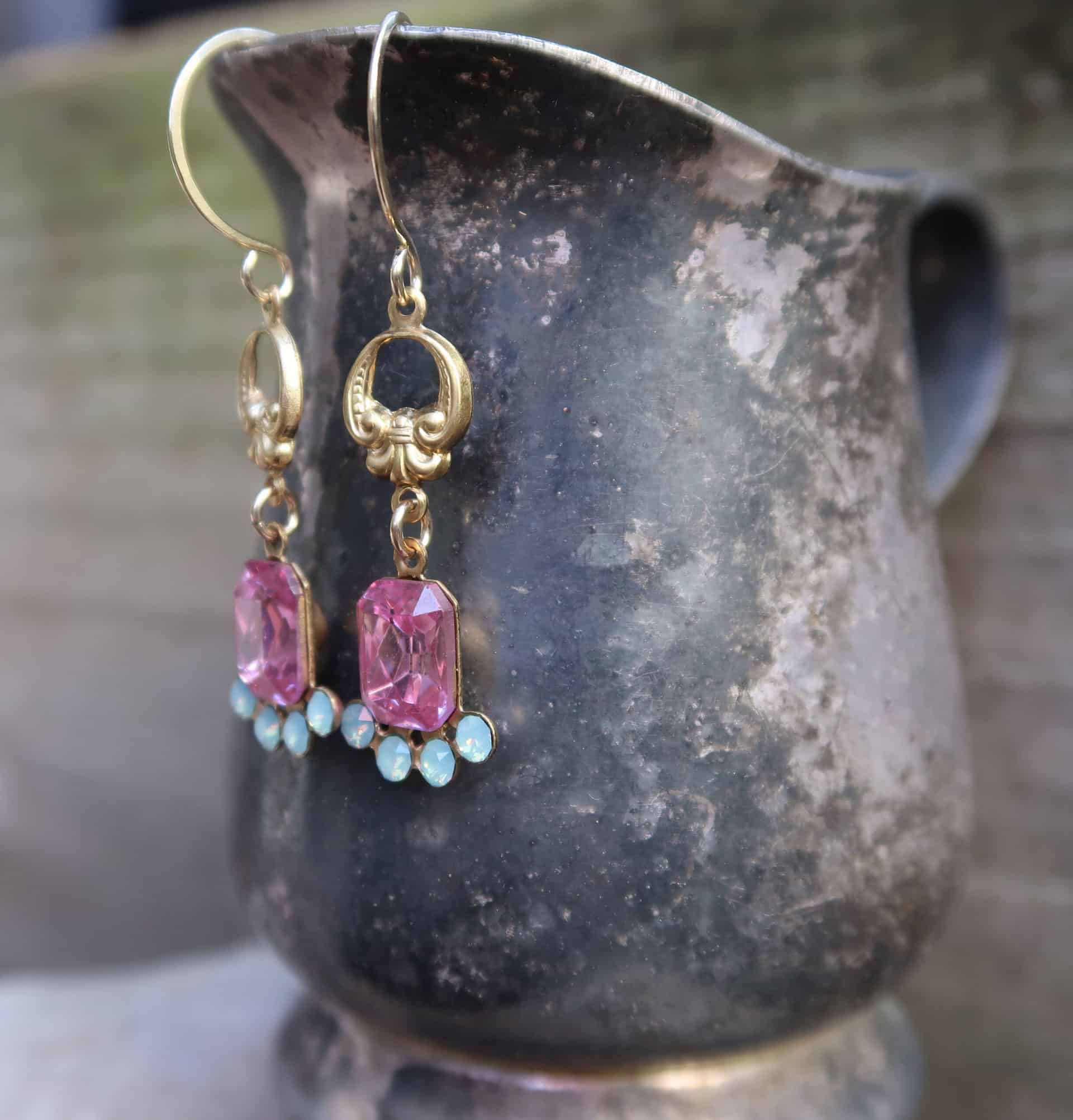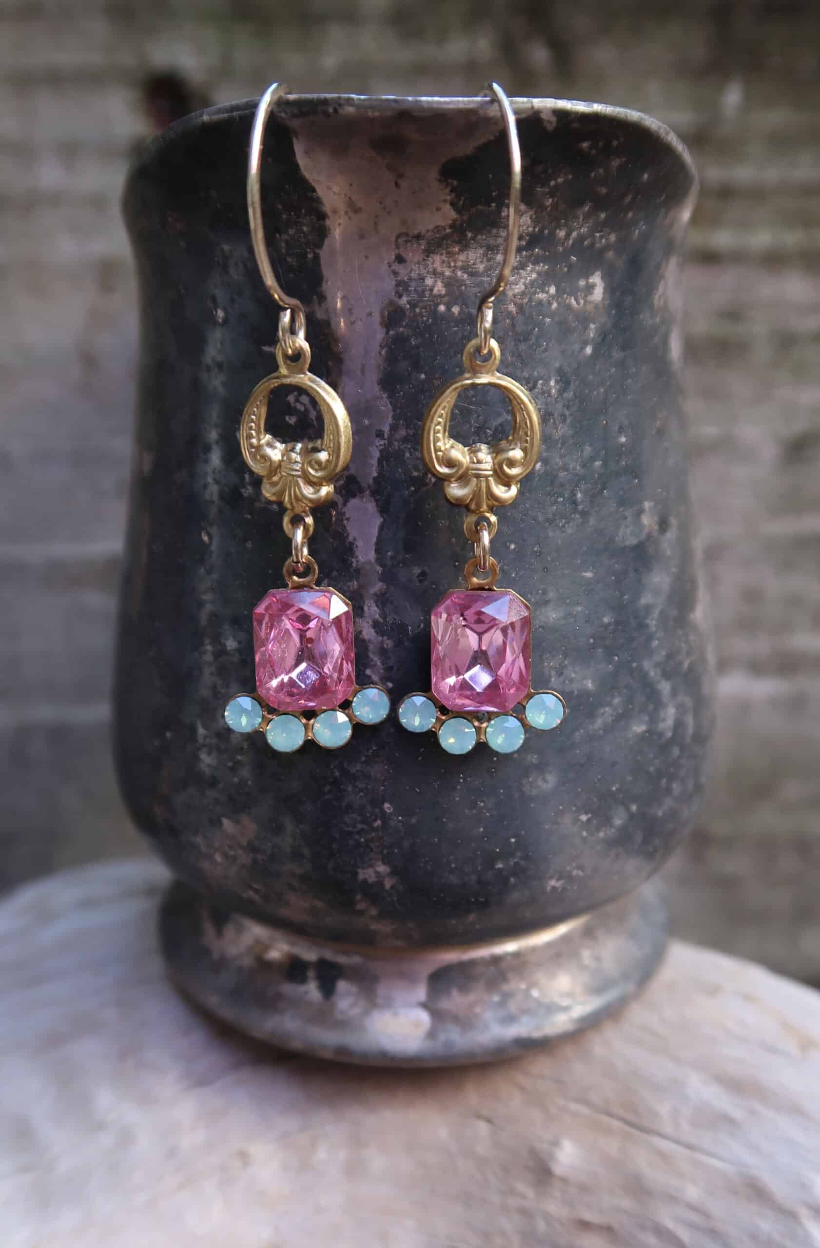 Vintage 1950’s Austrian and Czechoslovakia Crystals in rose and pacific opal hang below victorian brass on hand made 14k gold filled ear wires