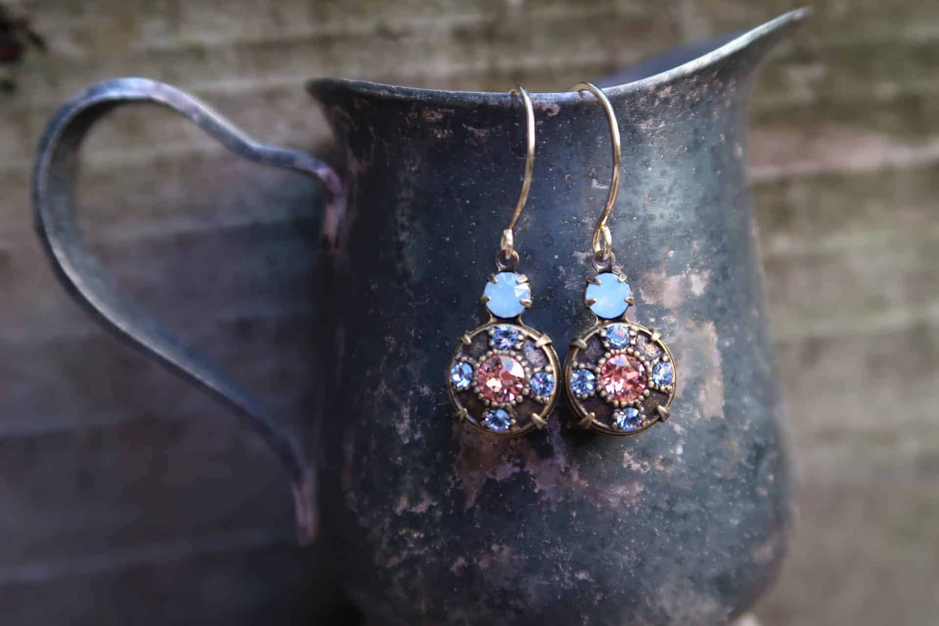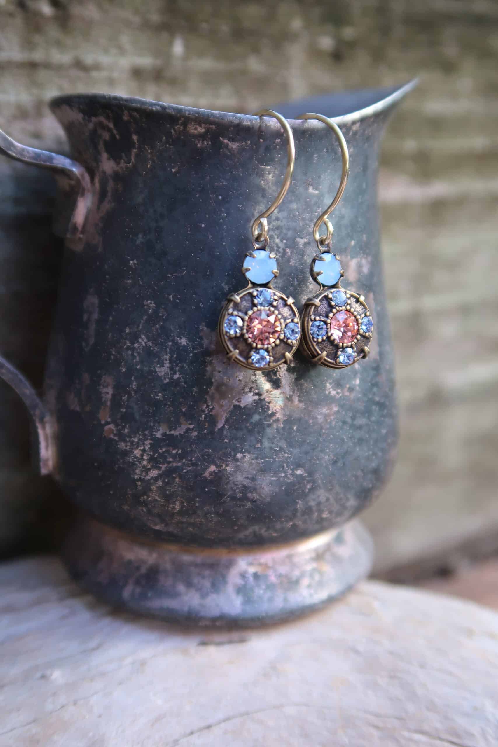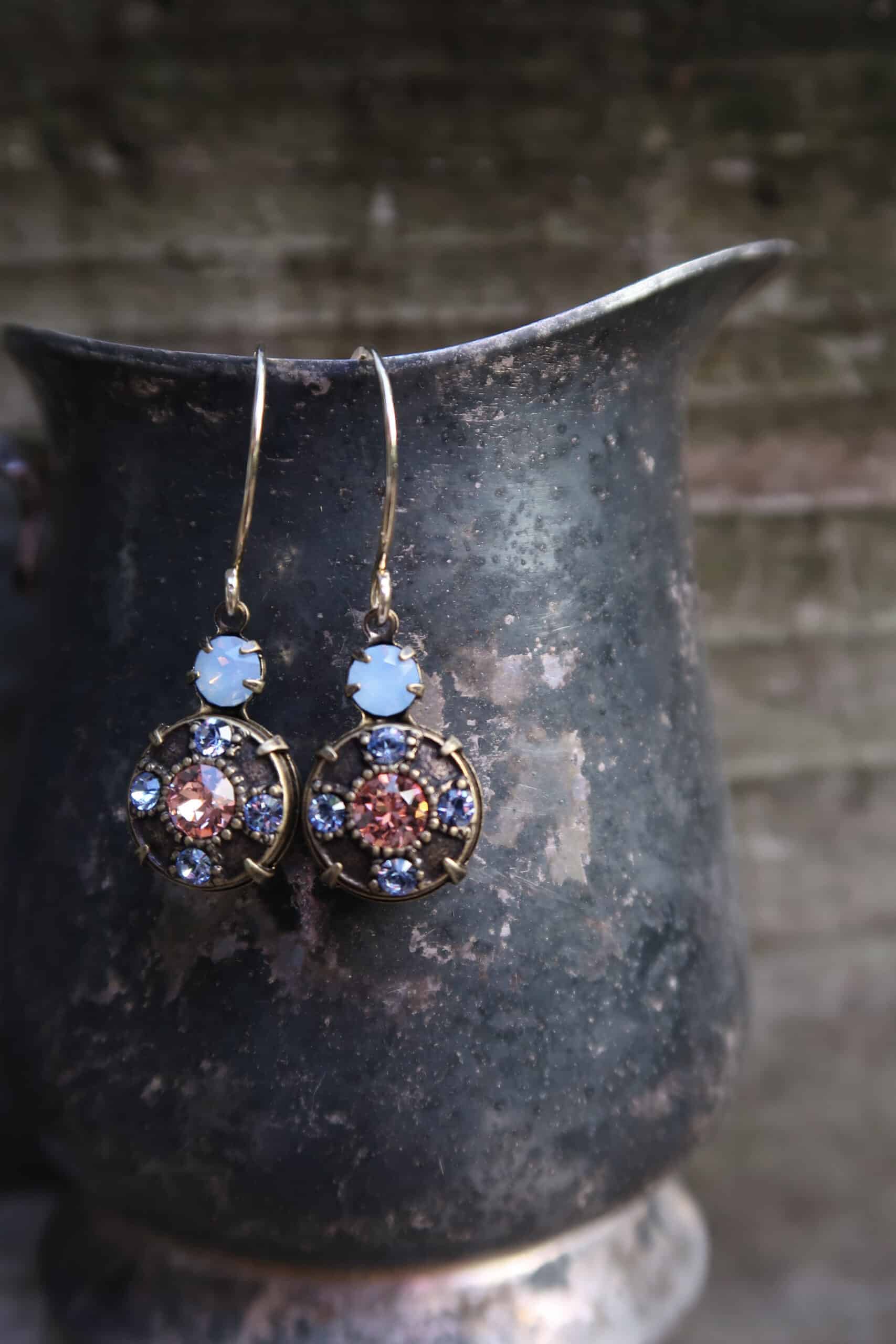 Vintage Swarovski Crystals in blue opal, light sapphire and peach rose on hand made 14k gold filled ear wires
