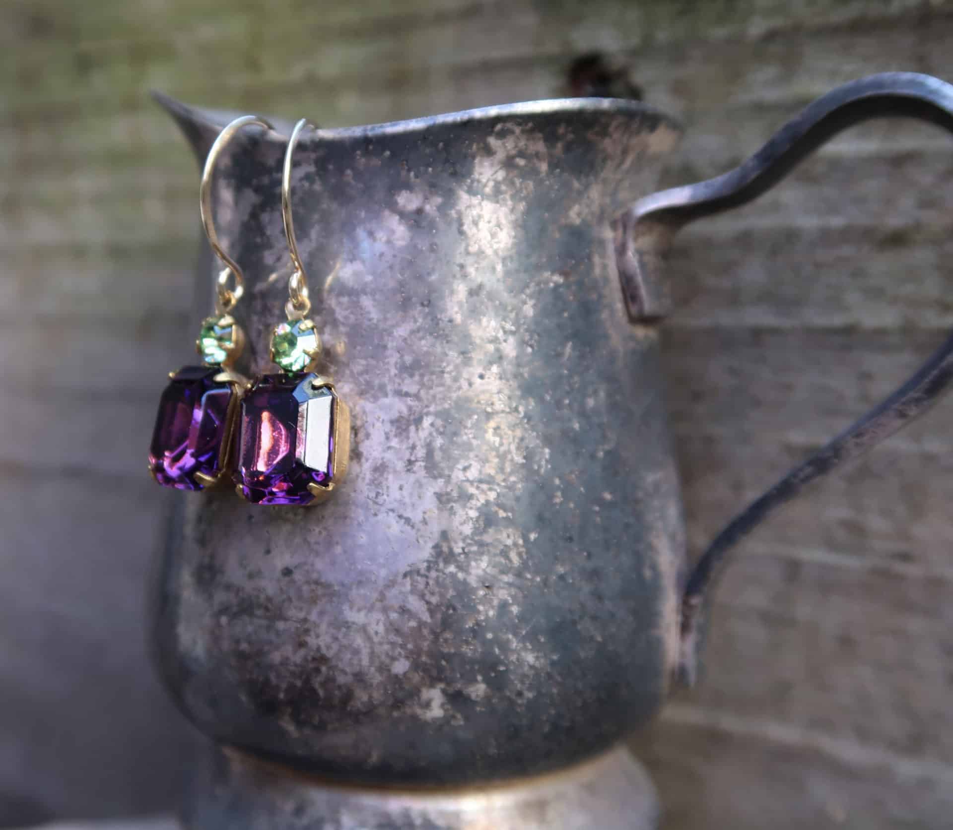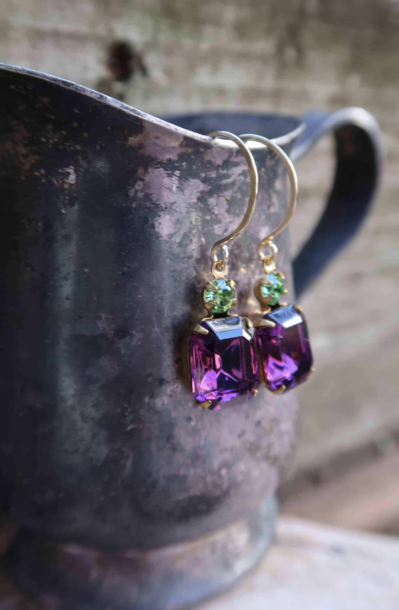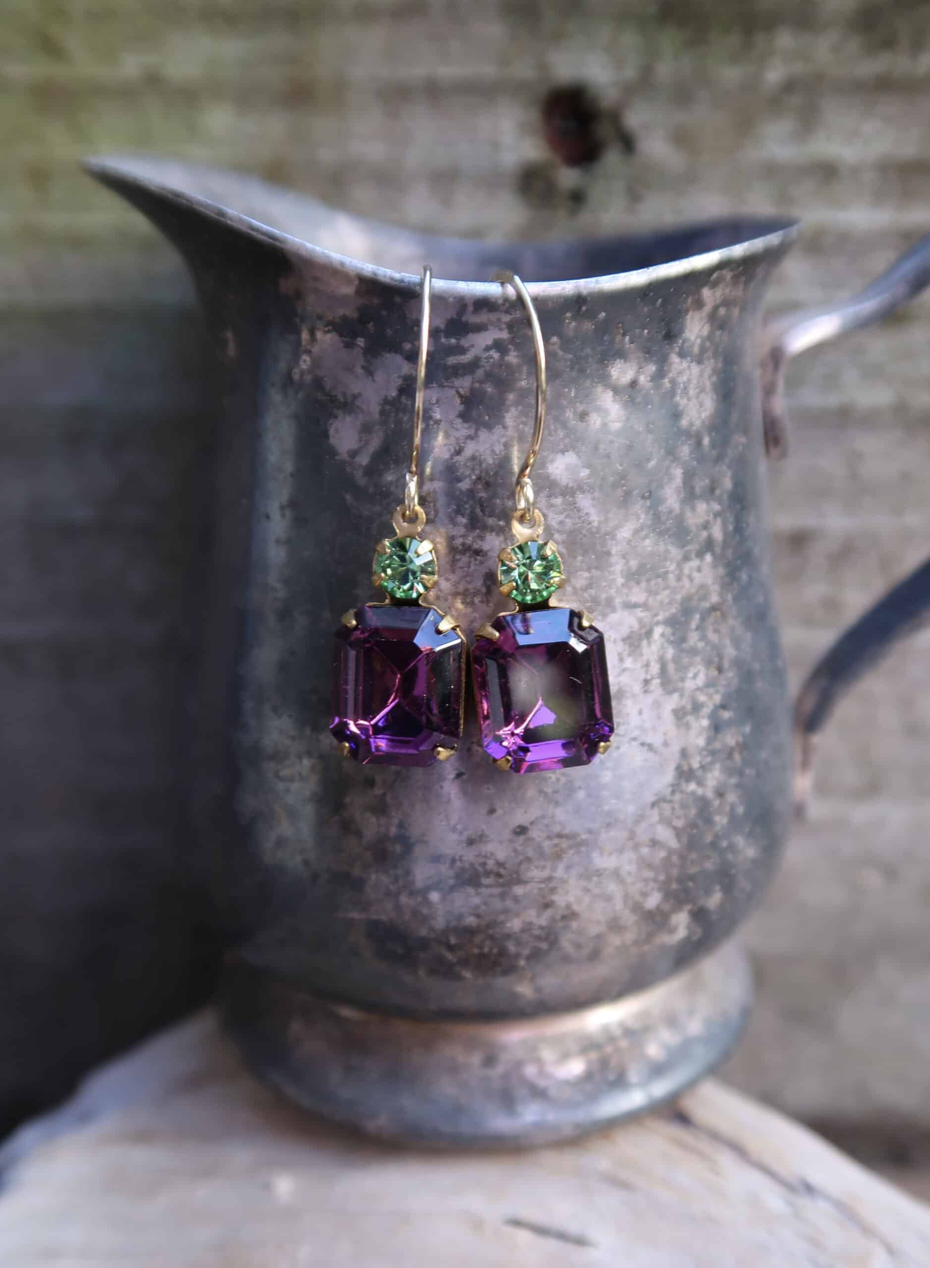 Vintage Swarovski crystals in peridot and amethyst on hand made 14k gold filled ear wires