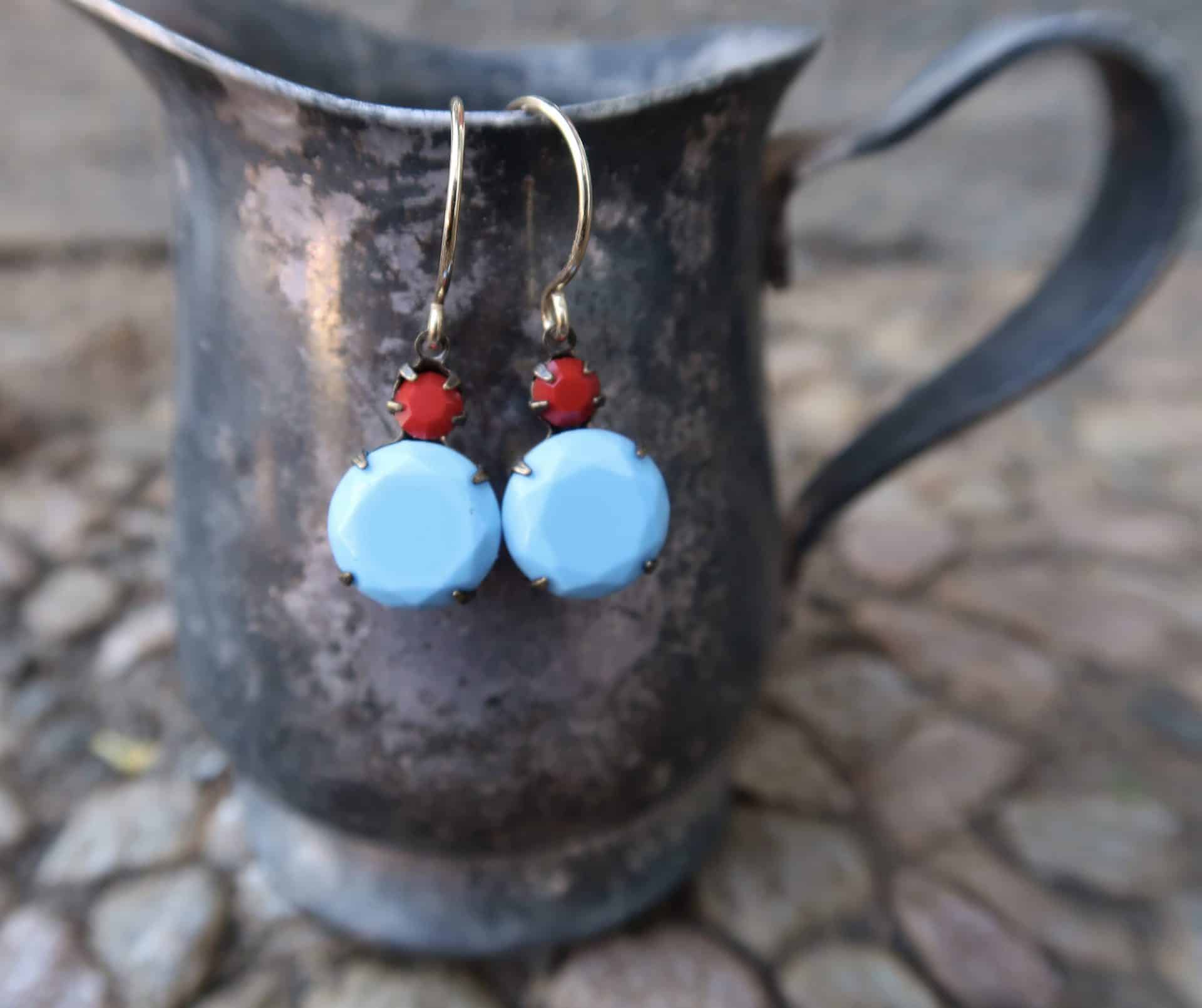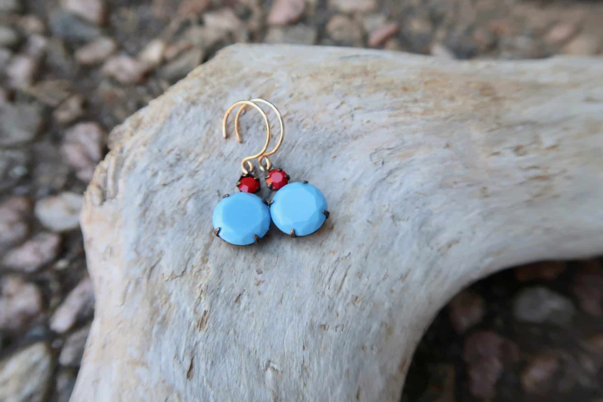 Vintage turquoise faceted glass set in brass below a cherry red rhinestone on hand made 14k gold filled ear wires.